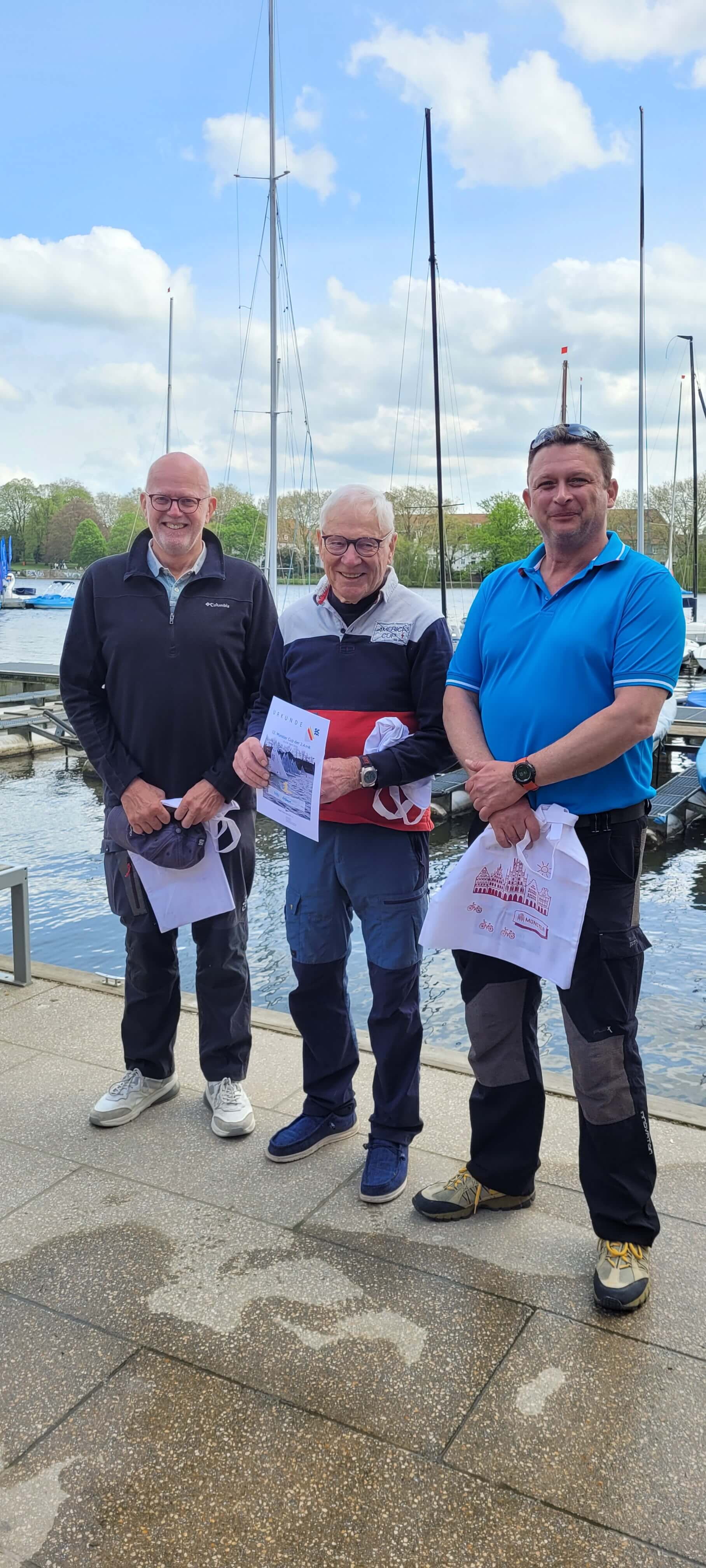 Nach den durchaus windigen ersten drei Wettfahrten des ersten Tages lag der Münsteraner Andreas Greufe auf Platz eins. Nach Abschluss der fünf Wettfahrten hatte – mal wieder -die Seglerlegende Uli Libor (2x Silbermedaillengewinner) Platz eins erobert. Libor (NRV) kam mit den drehenden Winden und schwierigen Bedingungen des zweiten Tages am besten zurecht. Starker Zweiter wurde Michael Jakobs (YCSB) vor dem Münsteraner Andreas Greufe auf Platz drei. Die ersten Drei hatten sich punkte-mäßig ordentliche vom Feld abgesetzt. Platz vier erreichte der überraschend stark segelnde Münsteraner Bootszubehörhändler Stefan Kaste. Topp Bedingungen und guter Wind machten dieses Regattawochenende für die Aktiven auf dem Wasser wie für die Spaziergänger an Land zu einem erstklassigen Event am Zuschauer freundlichen Aasee.