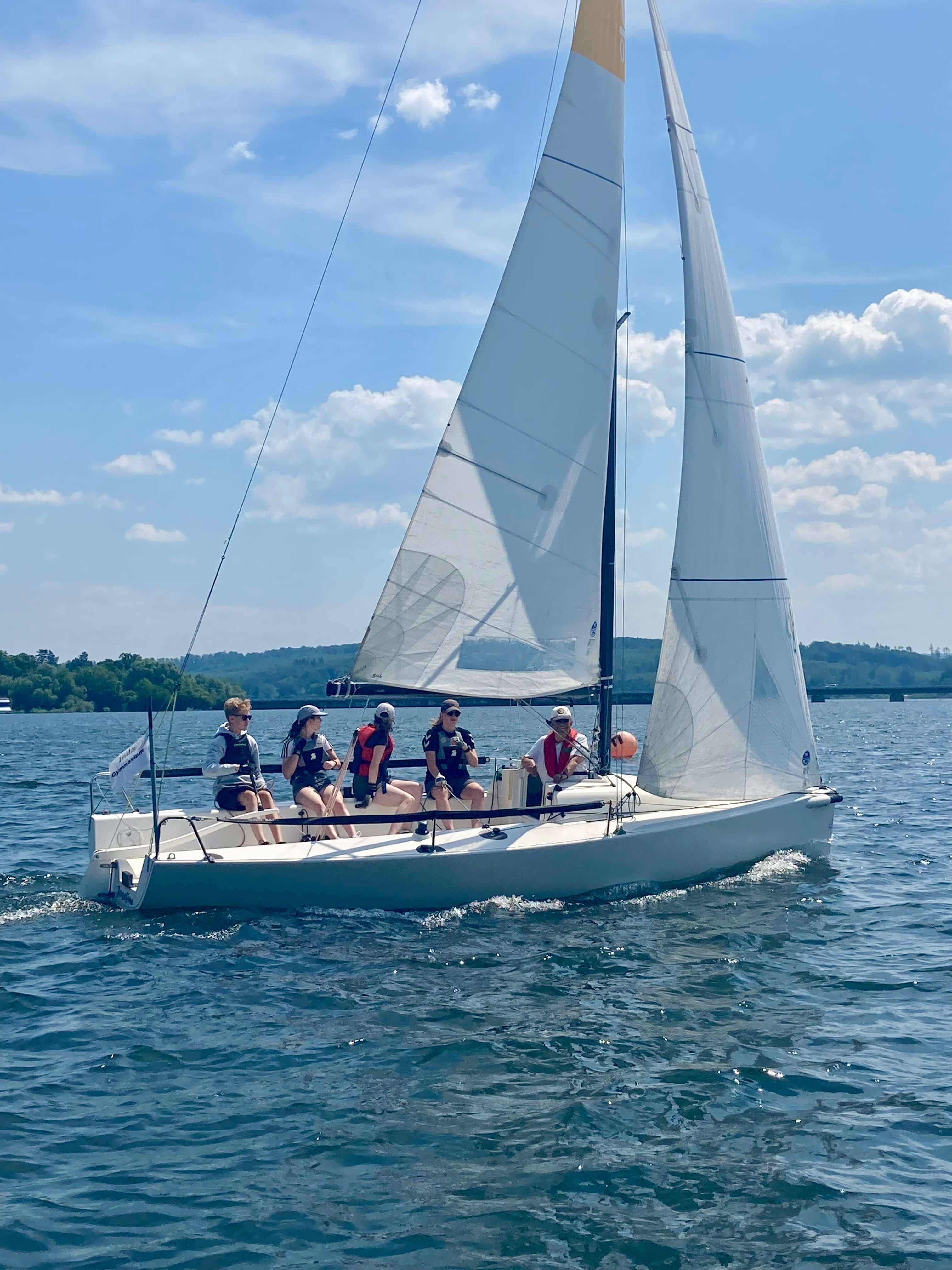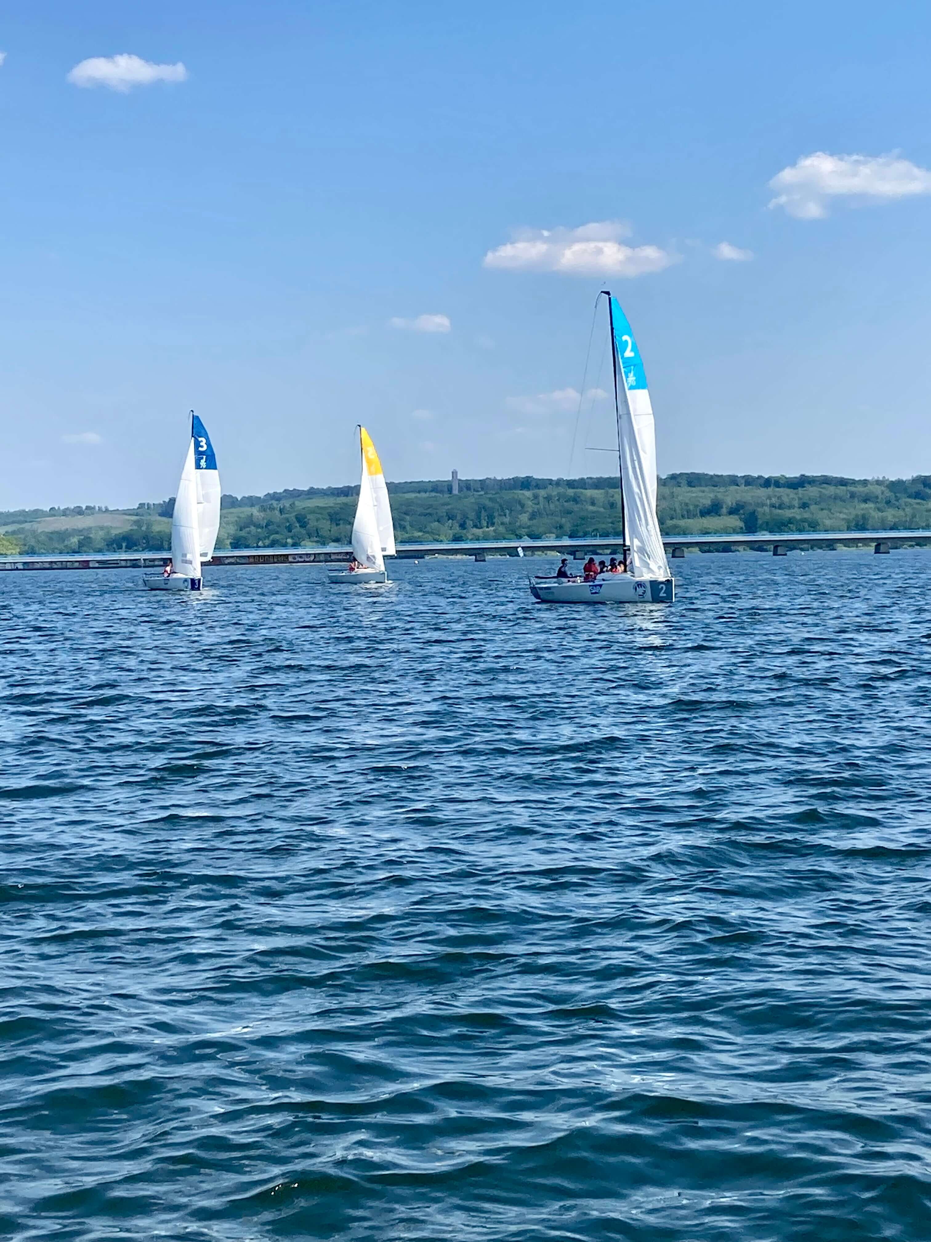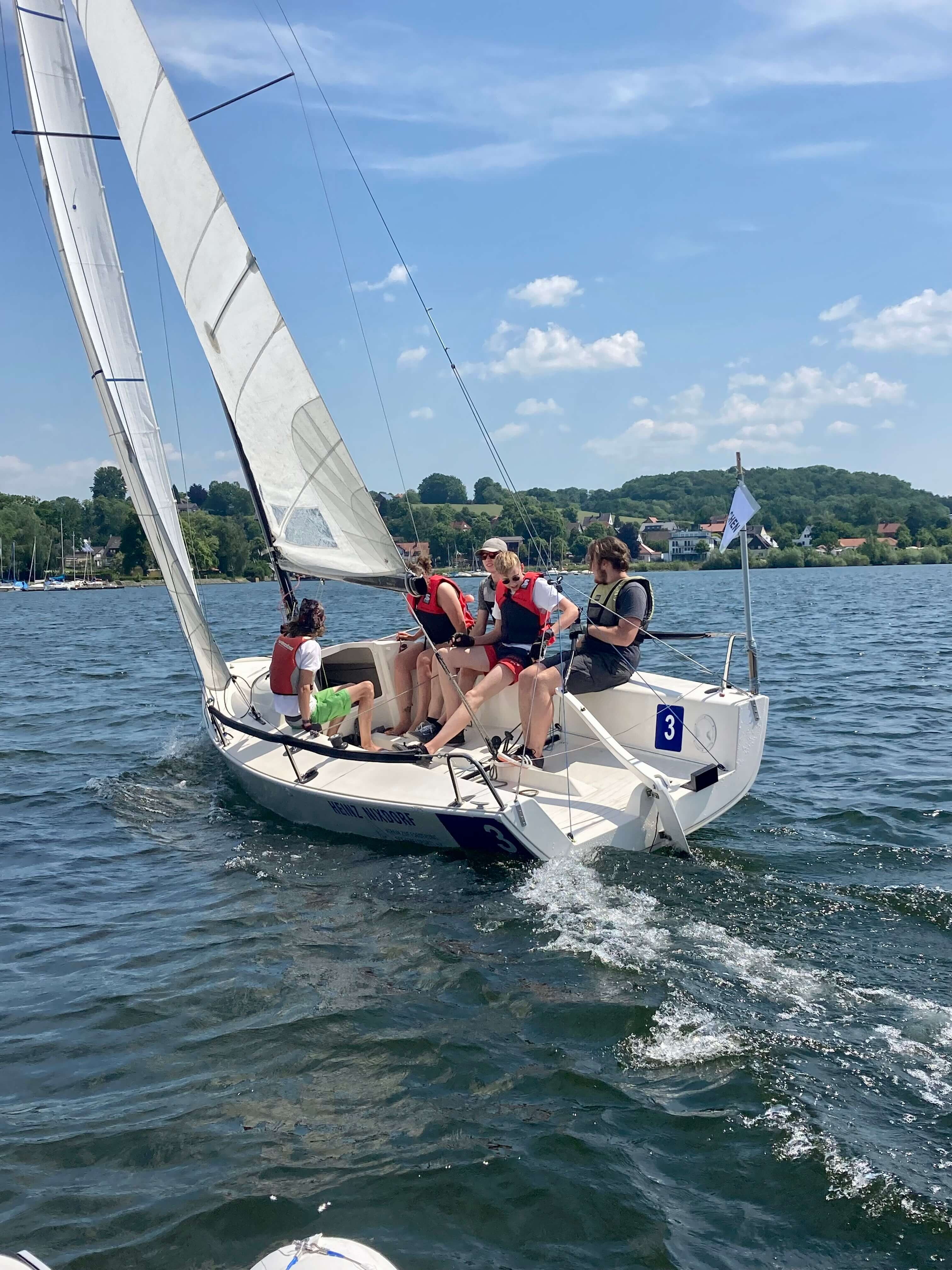 5 Teams aus ganz NRW kamen zum Möhnesee, um bei traumhaftem Wetter an die 30 Grad und konstantem Ostwind um die Schulmeisterschaft zu segeln. 4 Schüler*innen einer Schule bildeten ein Team. Mit an Bord war eine Lehrperson, die aber nicht aktiv ins Geschehen eingreifen durfte.