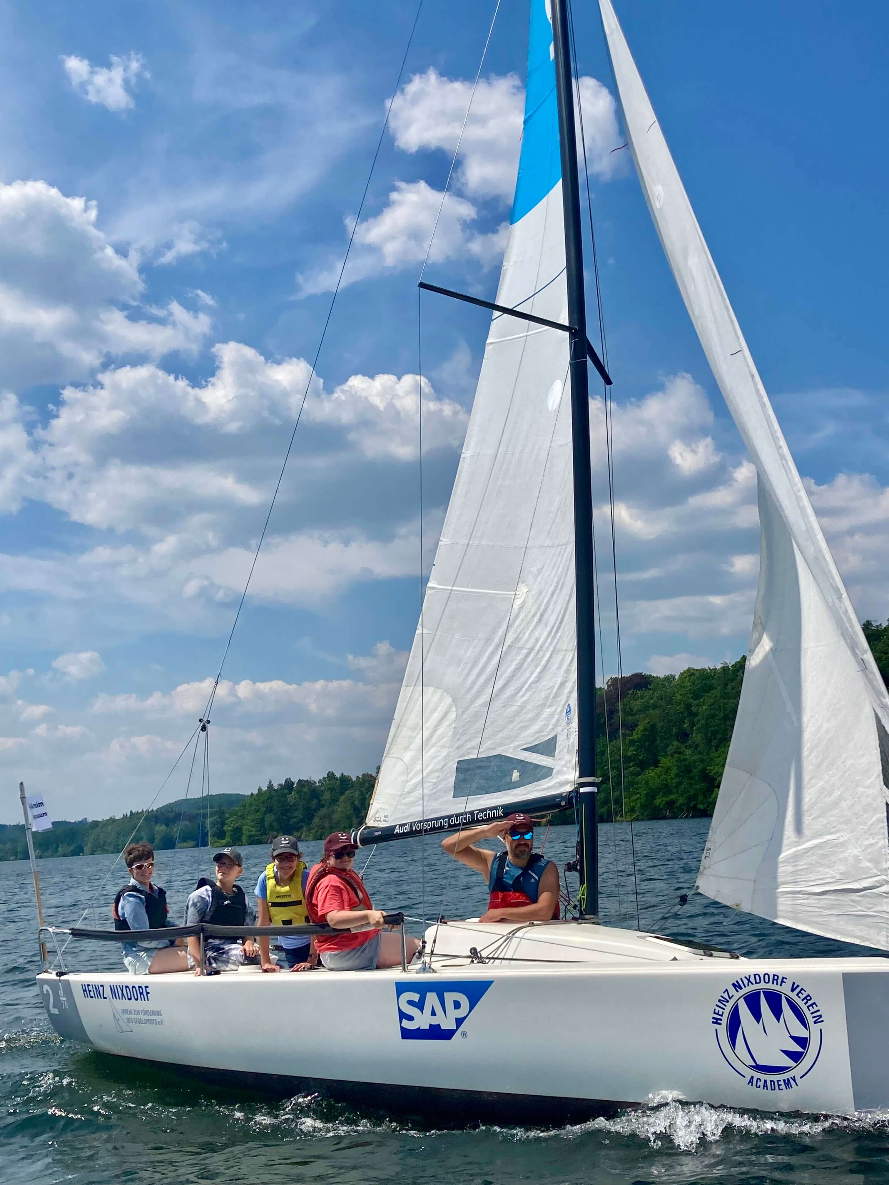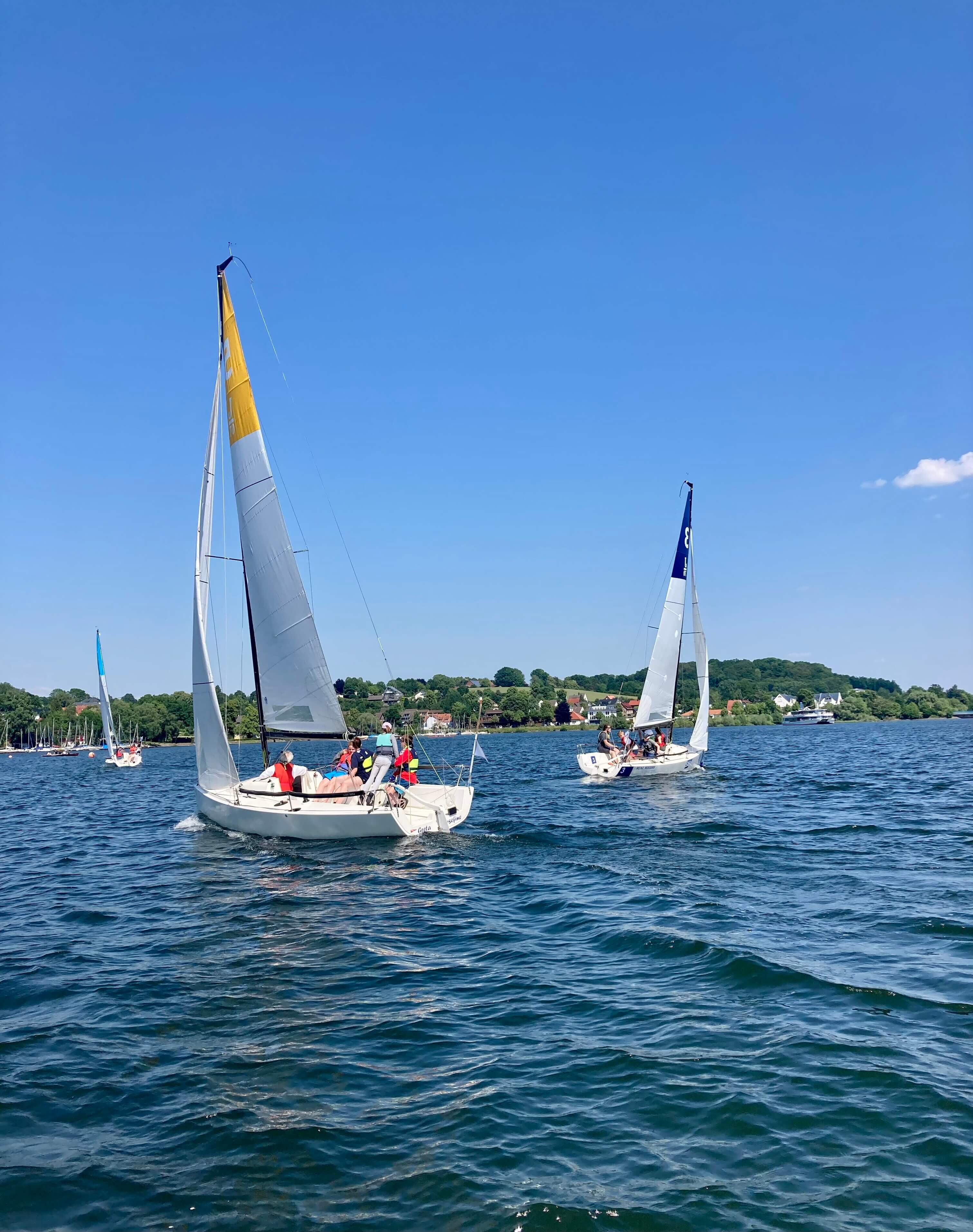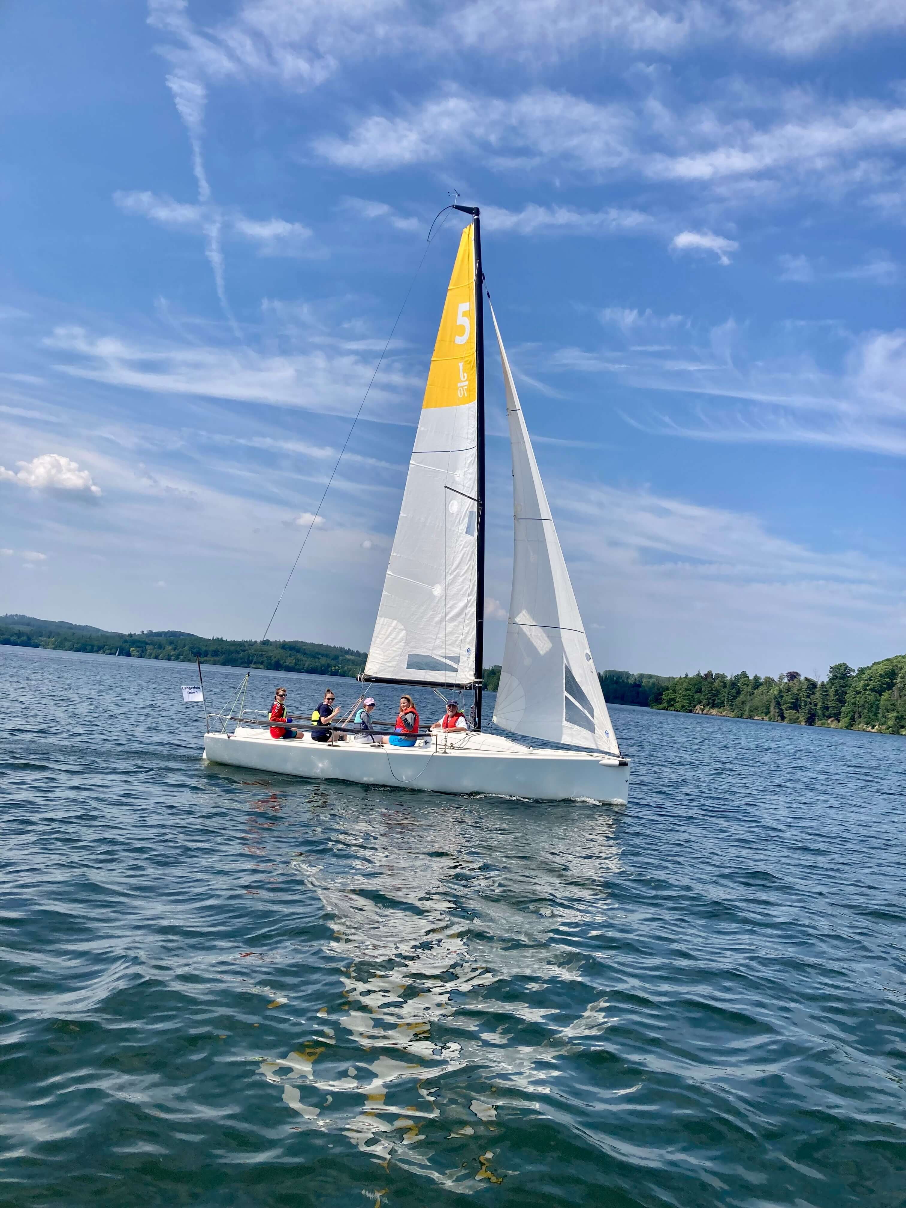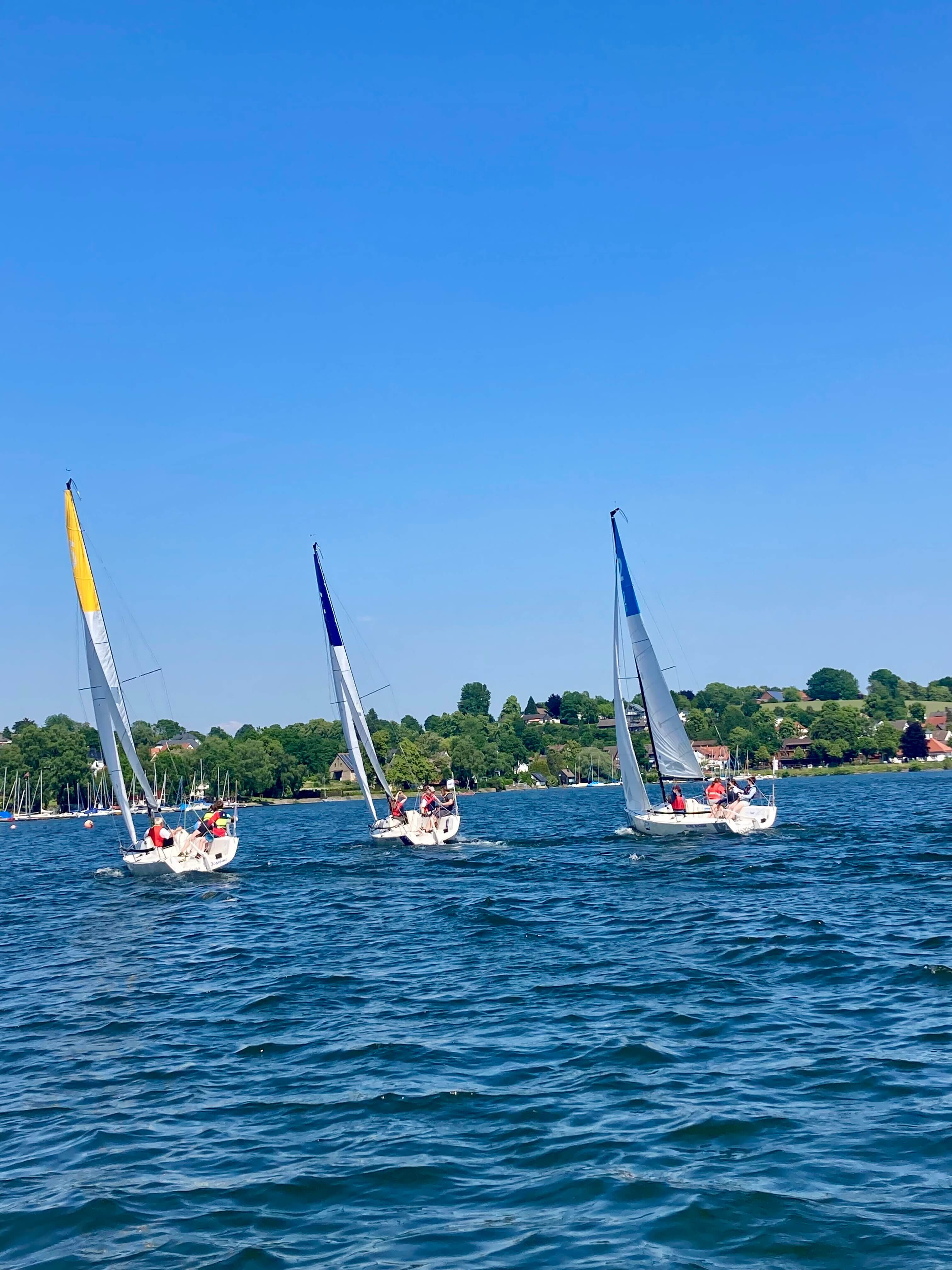 5 Teams aus ganz NRW kamen zum Möhnesee, um bei traumhaftem Wetter an die 30 Grad und konstantem Ostwind um die Schulmeisterschaft zu segeln. 4 Schüler*innen einer Schule bildeten ein Team. Mit an Bord war eine Lehrperson, die aber nicht aktiv ins Geschehen eingreifen durfte.