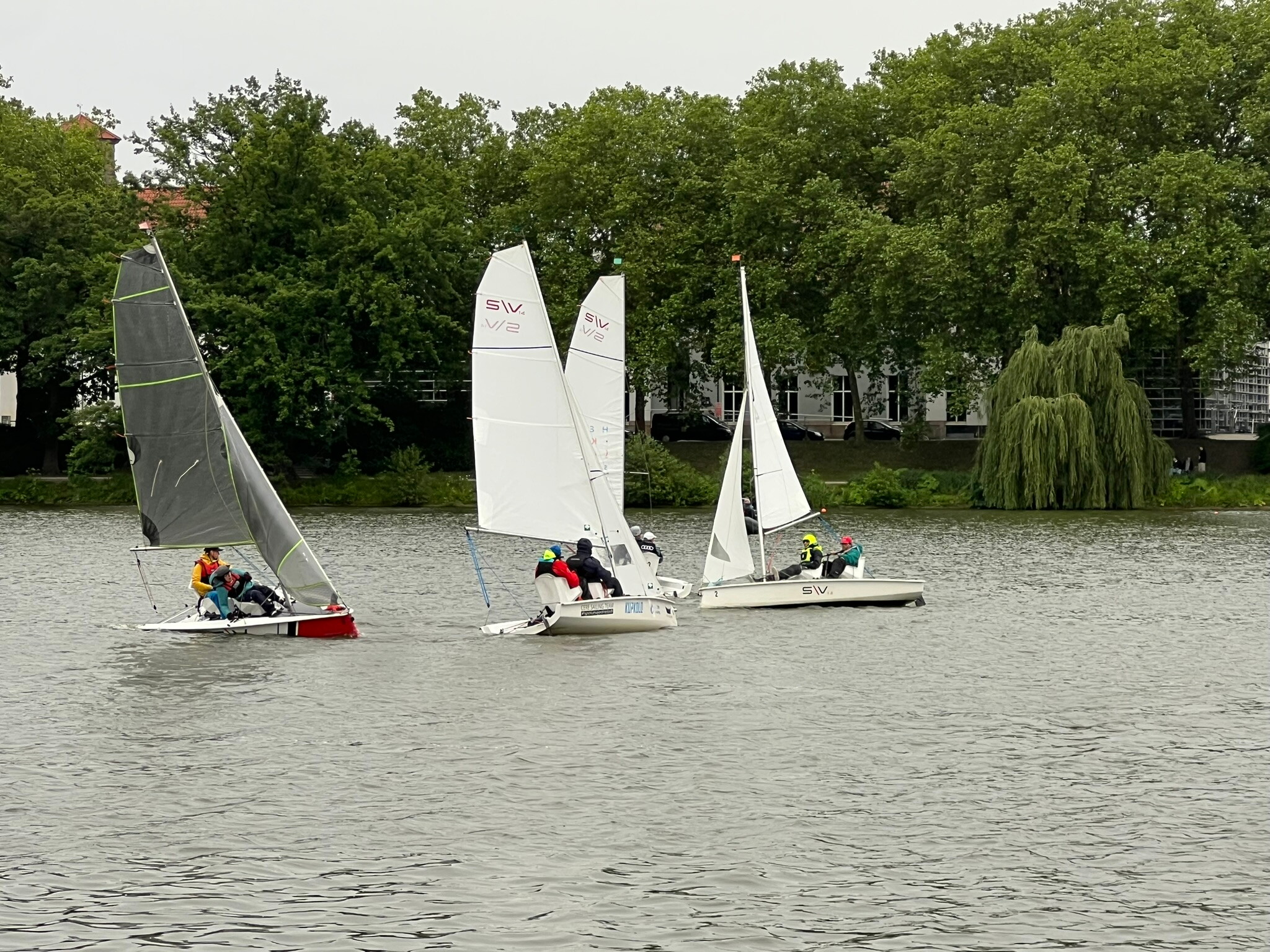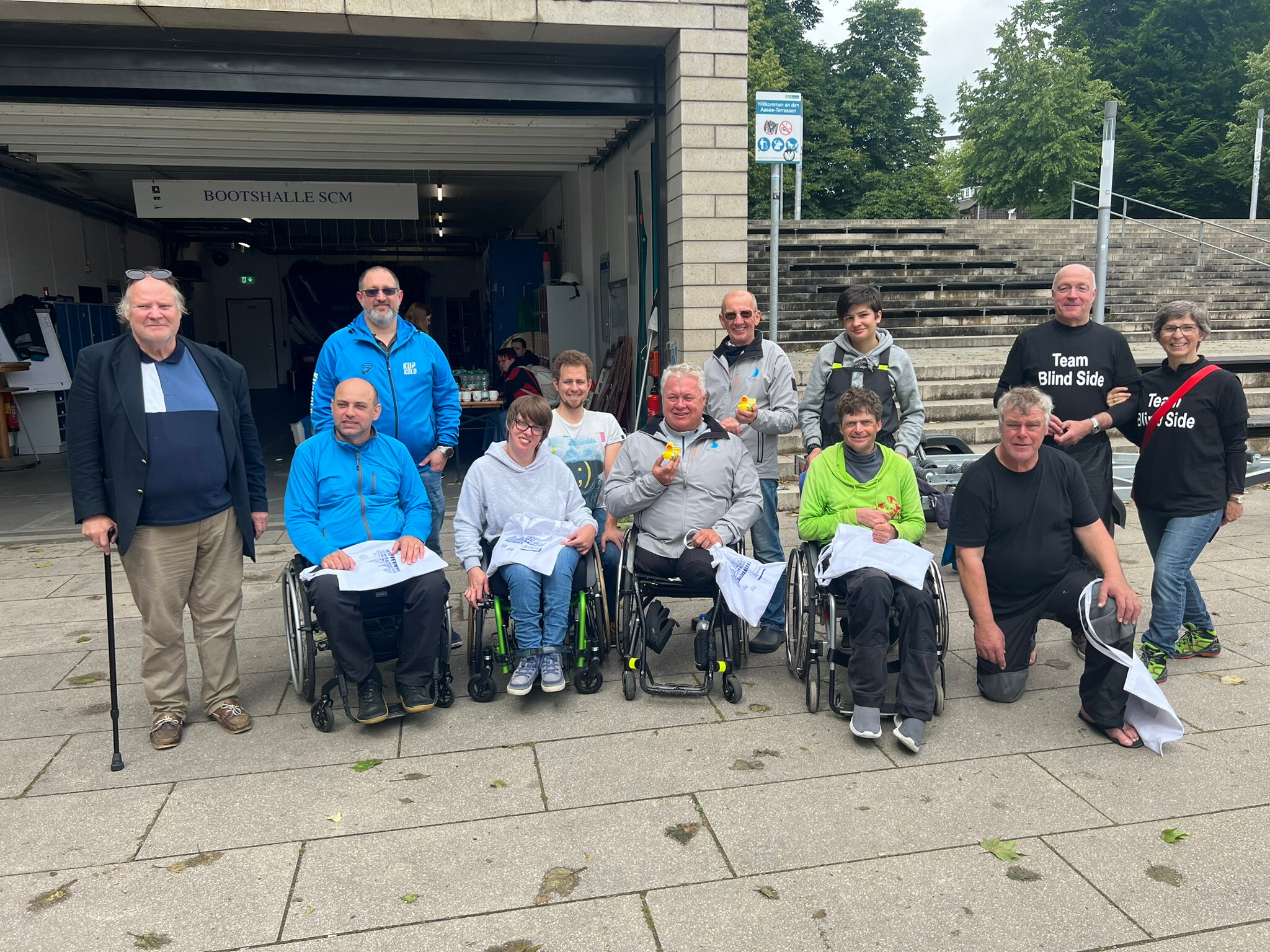 Die Wettervorhersage war nach den Sonnentagen zuvor eher mäßig als fast alle Teams schon am Freitagabend beim Segelclub Münster eintrafen und die Boote aufbauten und zu Wasser brachten. Samstagmorgen wurden bei trockenem und erstaunlich gutem Wetter letzte Hand an die komplexe aber für inklusives Segeln ideale Technik der SV 14 Boote gelegt. Das sportliche Boot ist mit speziellen elektrischen Quer-Neigesitzen ausgestattet, die es den körperbehinderten Seglerinnen und Seglern ermöglichen, das Boot immer aufrecht sitzend zu Segeln. Ausgestattet mit Fock, Großsegel und sportlichem Gennaker können so jeweils ein körperlich beeinträchtigter Segler und ein nicht körperlich beeinträchtigter Segler/Seglerin an inklusiven Segelregatten teilnehmen.