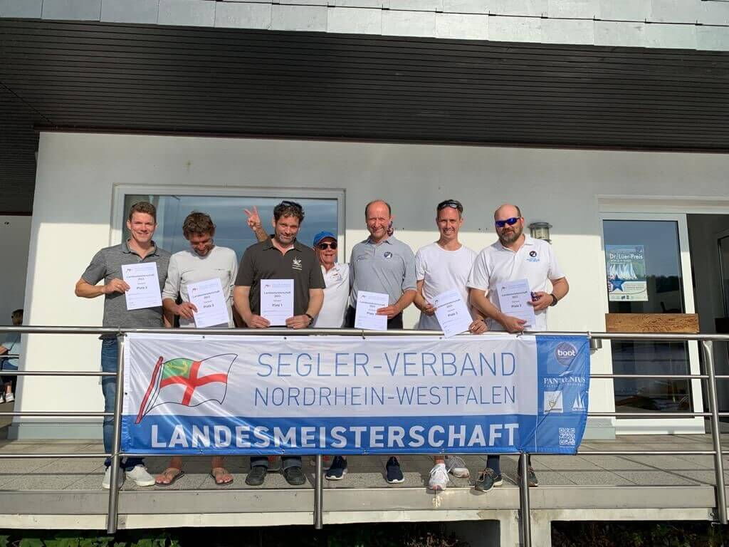 Der Sonntag brachte schließlich die besten Segelbedingungen mit Kaiserwetter, und so konnten weitere 4 Wettfahrten durchgeführt werden. Insgesamt gab es somit 5 Wettfahrten mit einem Streicher. Frank Tusch und Sven Winkelmann setzten sich dabei am Ende als Sieger durch, gefolgt von Martin Jahrmarkt mit Kristian Klein und Marko Hasche mit Peter Hoffmann. Tuschi und Sven sicherten sich nicht nur den Sieg bei der Regatta, sondern wurden auch NRW Landesmeister und dürfen die Stare bei der Meisterschaft der Landesmeister vertreten.