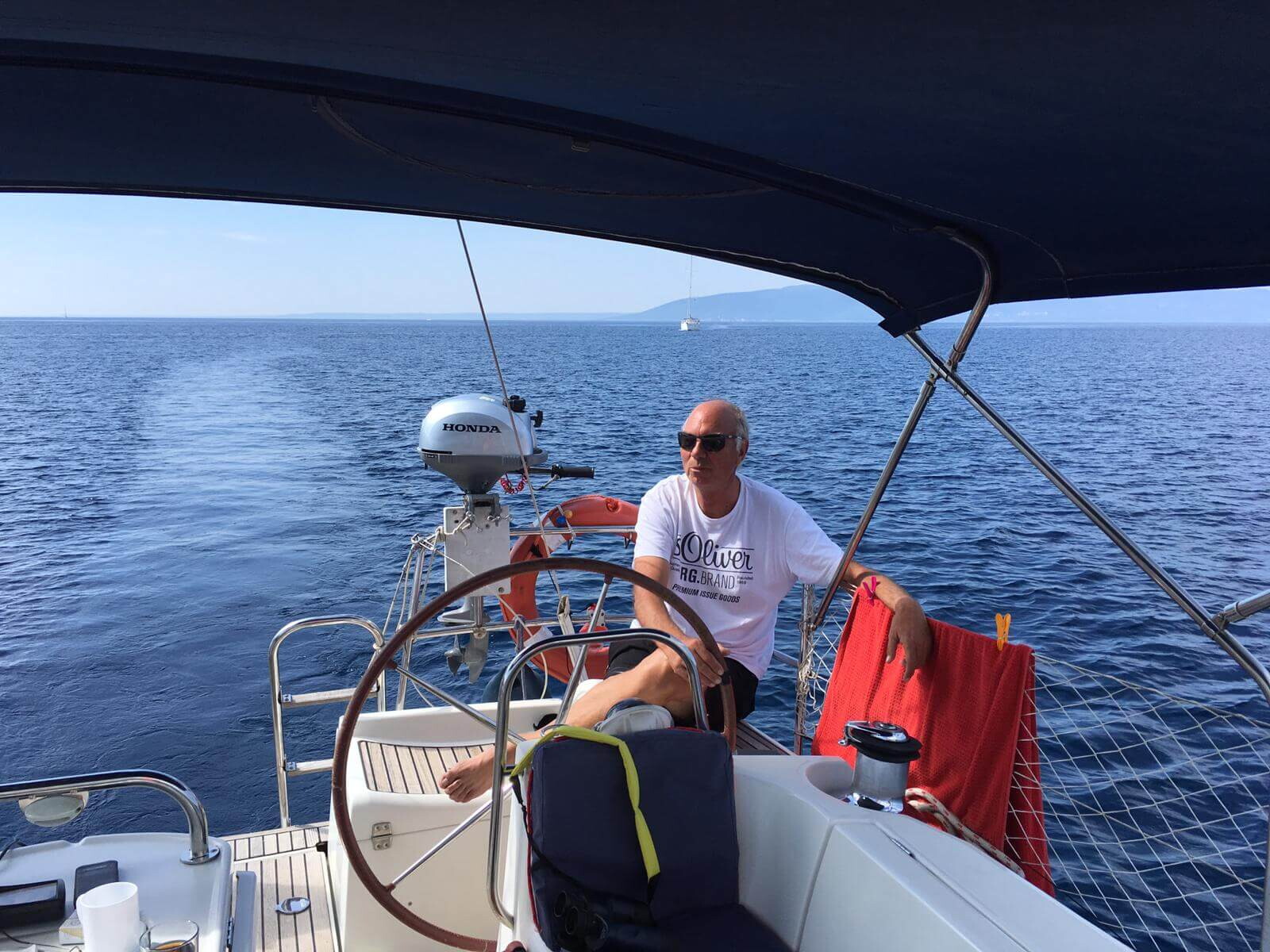 18.09., Auslaufen um 10:30 Uhr! Der Wetterbericht verspricht sonniges Wetter, 27 Grad und schwachen Wind aus wechselnden Richtungen! Unser Segelkamerad hat keinen Bock mehr auf Motoren. Er verlässt uns und macht sich auf den Rückweg Richtung Pula. Wir geben noch nicht auf und setzen unseren Törn Richtung Süden fort. Unser Ziel ist die Ankerbucht in Unije, dem südwestlichsten Punkt Kroatiens, dort lassen sich nach einem Bad im kristallklaren Wasser die Fische aus der Hand füttern. Einsam unterm funkelnden Sternenhimmel genießen wir ein köstliches selbst zubereitetes Menü, Spaghetti mit Würstchen.