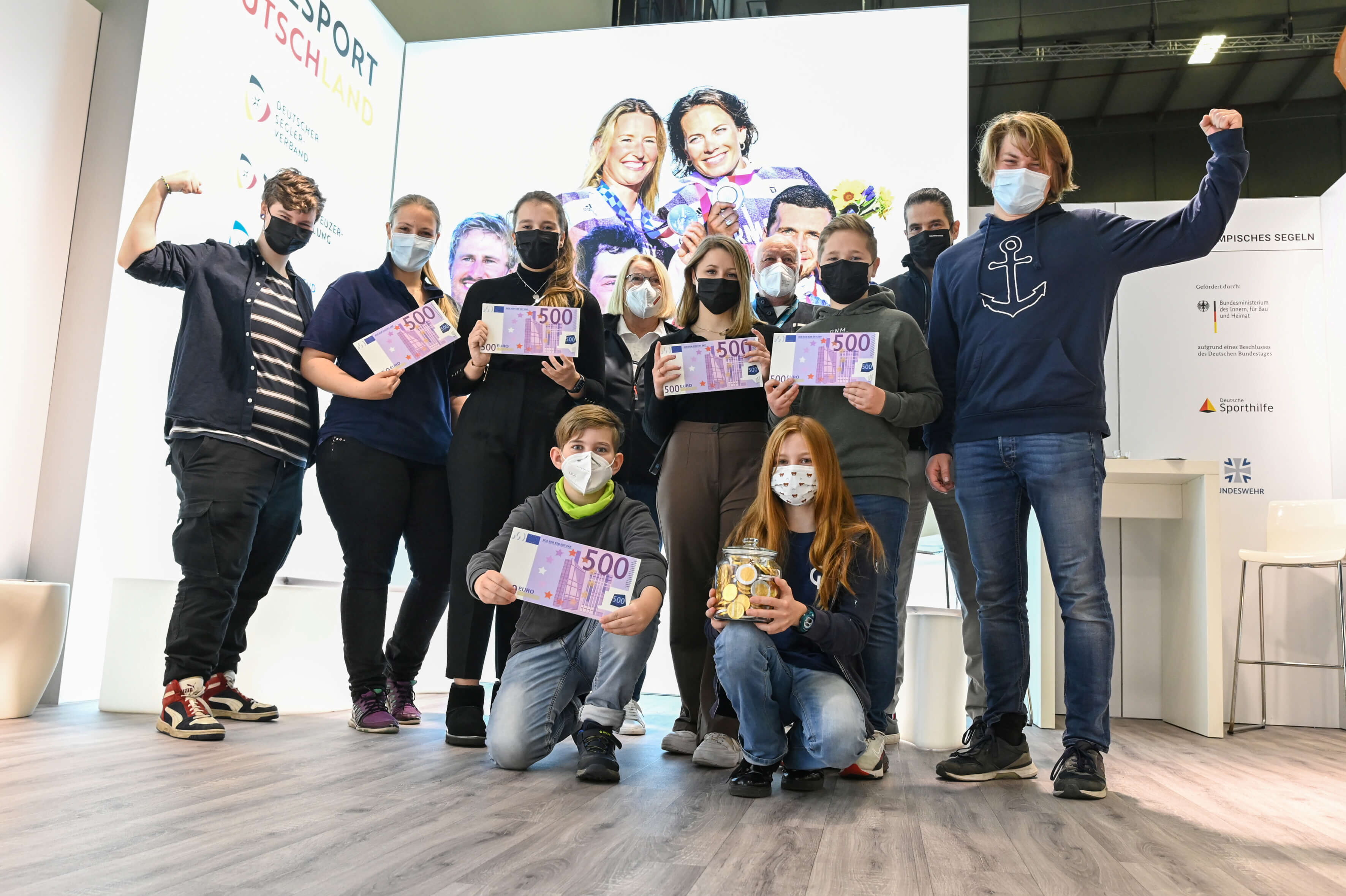 Bildunterschrift: Die Jugendabteilung des SV Vorwärts Gronau 09 freute sich über die Auszeichnung zum Verein des Jahres und das damit verbundene Preisgeld in Höhe von 2.500 Euro. Übergeben wurde der Preis von DSV-Präsidentin Mona Küppers, Hermann Hell, Herausgeber der Segler-Zeitung und dem Projektleiter der Boot & Fun, Daniel Barkowski (3. Reihe, v.l.n.r.).