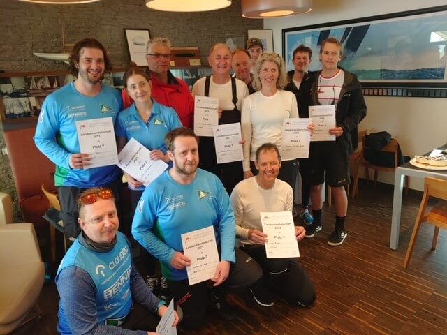 Bei sehr schwierigen Bedingungen konnten am Samstag drei Wettfahrten gesegelt werden. Nach einem gelungenem Abendprogramm brauchten die Segler am Sonntag etwas Geduld. Am Ende wurde das Warten mit 2 Läufen am Sonntag doch noch belohnt. Der Titel des Landesmeisters 2023 ging an die Crew von der Bevertalsperre vom SVWU mit der Ingo Binder am Steuer. Den 2. Platz belegte das Team vom Bocholter Yachtclub mit Kolja Paus an der Pinne. Dritter wurde Holger Neuhaus mit seinem Team vom WYD.