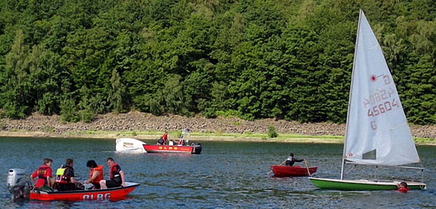 Ein außergewöhnliches Training für DLRG-Bootsbesatzungen des Bezirks Süd-Sauerland gab es im Juli 2014 am Biggesee im Sauerland. Der Seglerverband Nordrhein-Westfalen (SVNRW) hatte zusammen mit dem Referat Bootswesen vom DLRG Landesverband Westfalen Bootsführer und Wachgänger der DLRG hierzu eingeladen. Die Teilnehmer konnten sich mit den besonderen praktischen Gegebenheiten bei der Bergung von verunglückten Seglern vertraut machen. Zuerst erhielten sie vor Ort vom Wassersportverein Biggesee (WSVB) einen Überblick über die wesentliche Ausstattung von Segelbooten, um bei einer Hilfeleistung je nach Situation die richtigen Maßnahmen einzuleiten. Vor den Stegen des WSVB hatten die DLRG Aktiven dann die Möglichkeit, einmal selbst ein Segelboot zu steuern und anschließend eine Bergung von Segler und Segelboot zu üben. Martin Diederich vom DLRG Landesverband, Rüdiger Siebers vom Bezirk Süd-Sauerland und Rolf Kantelhardt vom WSVB waren zufrieden mit dem Ergebnis der Übung. "Jetzt ist klar geworden, wie es überhaupt zu einem Mastbruch oder einer Kenterung kommen kann. Wir haben heute wertvolle Informationen sammeln können", so die Meinung der DLRG Bootsbesatzungen.