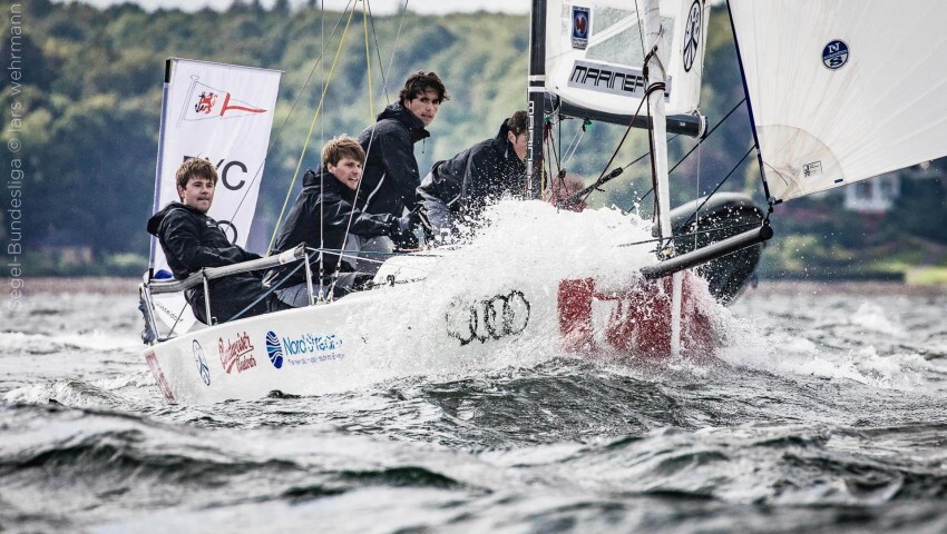 Es goss wie aus Kübeln, es windete ordentlich, in Böen war sogar Sturm angesagt bei der fünften Meisterschaftsregatta in der ersten Deutschen Segel-Bundesliga (DSBL). Trotz der besten Segelkleidung waren Timon Treichel, Mathias Weidenbach, Patrick Treichel und Philipp Schrader nass bis auf die Haut. „Ich weiІ gar nicht, durch welche Ritze das Wasser gedrungen ist. Aber die Sturzbäche von oben und das Ostseewasser von unten haben es irgendwie geschafft“, erläuterte Patrick Treichel. Sein Bruder Timon (20 Jahre) feierte bei unsäglichen äußeren Bedingungen seine Premiere als Bundesliga-Steuermann des Düsseldorfer Yacht-Clubs (DYC) bei der Meisterschaftswettfahrt vor Glücksburg und steuerte seine Crew auf Rang 14. Dadurch rutschte der DYC um zwei Plätze in der Gesamttabelle ab, steht aber immer noch auf einem Nichtabstiegsplatz. „Vor dem letzten Event einer Bundesliga-Saison waren wir noch nie so gut. Wir haben alles noch selbst in der Hand und werden zum Saisonabschluss auf dem Wannsee eine sehr starke Crew schicken“, meint Jan-Philipp Hofmann, Sportlicher Leiter des DYC-Bundesligateams.