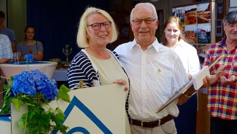 Die DSV-Vizepräsidentin und Ehrenvorsitzende des SVNRW Mona Küppers sprach in ihrer Laudatio zu den Gästen, die sich im Clubhaus des Wassersportvereins zur Feier ihres 40jährigen Bestehens getroffen haben. Ein würdiger Rahmen die Auszeichnung vorzunehmen, die eigentlich schon auf dem Verbandseglertag 2015 erfolgen sollte. Aufgrund gesundheitlicher Probleme des Geehrten musste das aber verschoben werden.