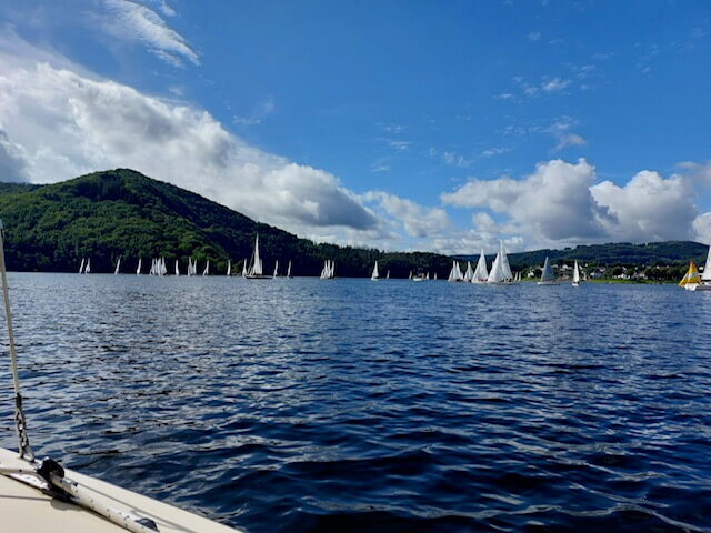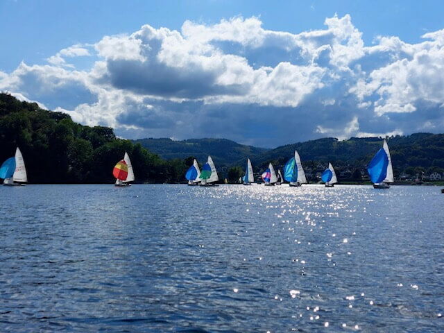 Doch nicht nur die Teilnehmerinnen und Teilnehmer hatten ihre Freude bei den insgesamt gesegelten vier Wettfahrten. Auch die Gäste, die auf den Schiffen der Rurseeschifffahrt als Passagiere unterwegs waren, hatten ihre helle Freude. Denn ihnen bot sich ein fantastischer Blick auf das Regattafeld. Insbesondere als viele Boote auf dem Weg zur Leetonne C in Höhe des Segelclub Jülich mit gesetzem bunten Spinnaker unterwegs waren, bewegte dieses fantastische Bild viele zum Zücken der Handys, um den Moment einzufangen. Überhaupt war die „Woffelsbacher Platte“ auf dem Rursee von den Regattaseglerinnen und -seglern dicht bevölkert, Ein großer Dank gilt daher den Kapitänen der Ausflugsschiffe, die routiniert, rücksichtsvoll und mit großem Geschick durch die Regattafelder manövrierten.