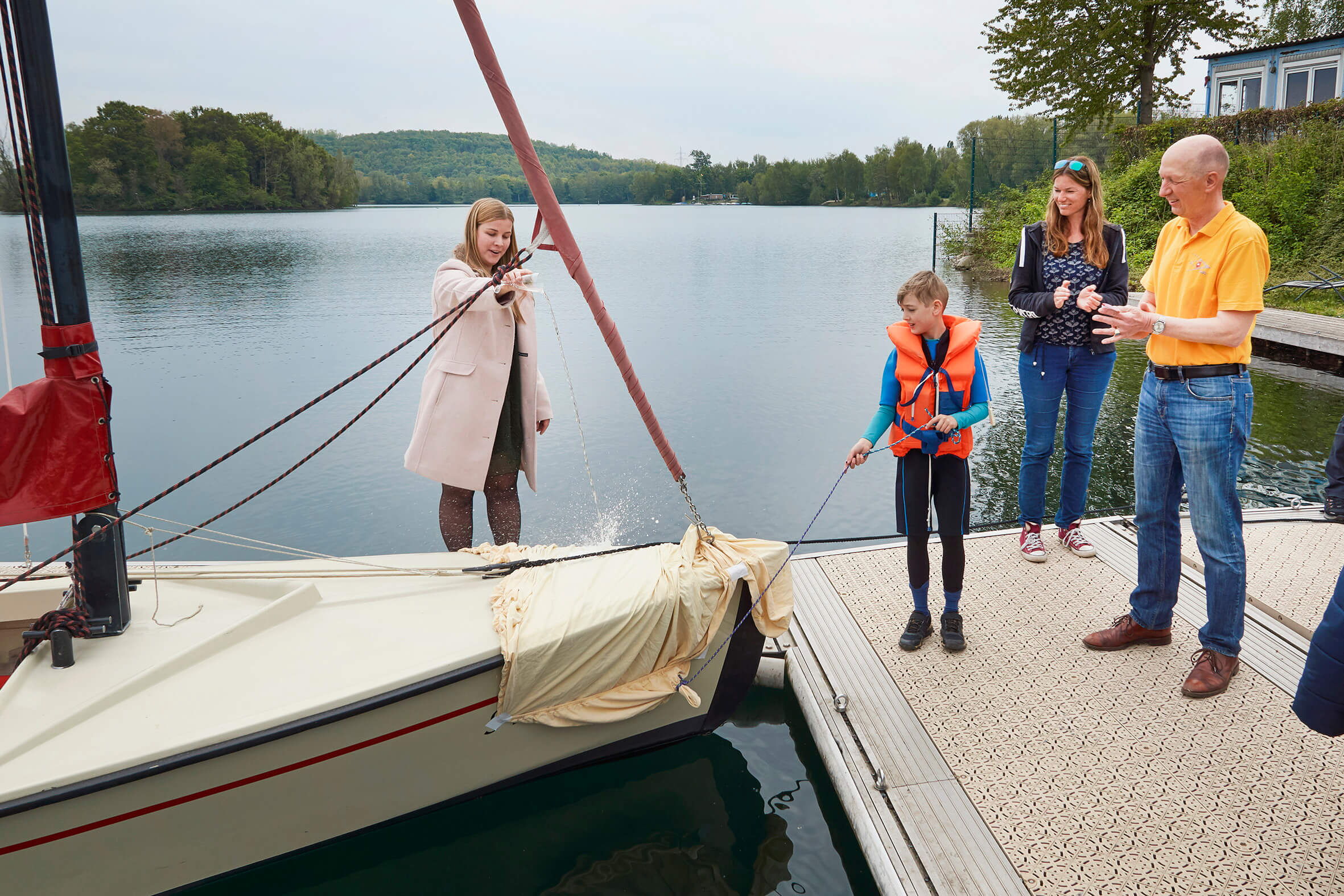 Der Polyvalk wurde am vergangenen Wochenende auf den Namen „Herr Rossy“ getauft, angelehnt an das Kleinod Rossenrayer See. Mit einem geselligen Brunch haben wir die Bootstaufe mit Rund 30 Mitgliedern gefeiert. Die Polyvalk („Valk“ niederländisch für Falke, der Vorsatz „Poly“ steht für den verwendeten Werkstoff Polyester), ist ein typisches Boot des friesischen Seengebietes. Mit ihrer Rollfock und dem beständig angeschlagenen Großsegel sind Valken schnell seeklar. Sie sind leicht zu bedienen und werden daher auch in der Ausbildung verwendet. Die Boote sind bequem und geräumig, sodass sie auch zu dritt oder zu viert gesegelt werden können und auch für Familien mit kleineren Kindern gut geeignet sind.