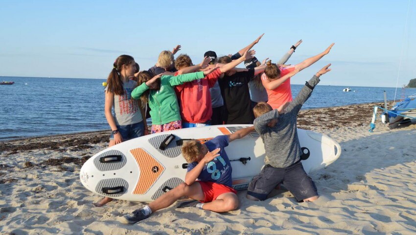 Um 10 Uhr bauen wir auf und lernen die sympathische Mädchentruppe aus Schleswig-Holstein (SH) kennen, die auf dem Bic Techno mit Steffi Schwarz vor Ort trainiert. Obwohl die Mädls sich selbst als Team „Fun“ bezeichneten und immer betonten, dass sie keine großen Ambitionen hätten, waren sie bei den gemeinsamen Einheiten konzentriert und motiviert. Auch die über Nordwindl angemeldeten Sportler Robert (Hamburg) und Finn (MP) schlossen sich unserer Trainingsgruppe an. Thorsten Wöll kümmerte sich mit viel Geduld um die Regatta-Rookies Lorena, Sylvana und Robert, die in den Wettkampfsport reinschnuppern wollten. Alle anderen haben in zwei täglichen Einheiten, die mal länger und windbedingt mal kürzer waren, von Montag bis Freitag gezeigt, aus welchem Holz sie geschnitzt sind. Logischerweise waren die Trainingsinhalte aufgrund der Flaute begrenzt: Kreuz- und Startpumptechnik bei 0-7 Knoten, Manöver und Spielformen, aber auch das „Wellenreiten“ auf dem Downwind bei wenig Wind. Windlose Stunden wurden mit zu Fachdiskussionen ausartenden Theorieeinheiten und kleinen Tow-in-Sessions gefüllt. Erfreulicherweise konnten wir in der großen Gruppe viele Starts und Mini-Races üben.