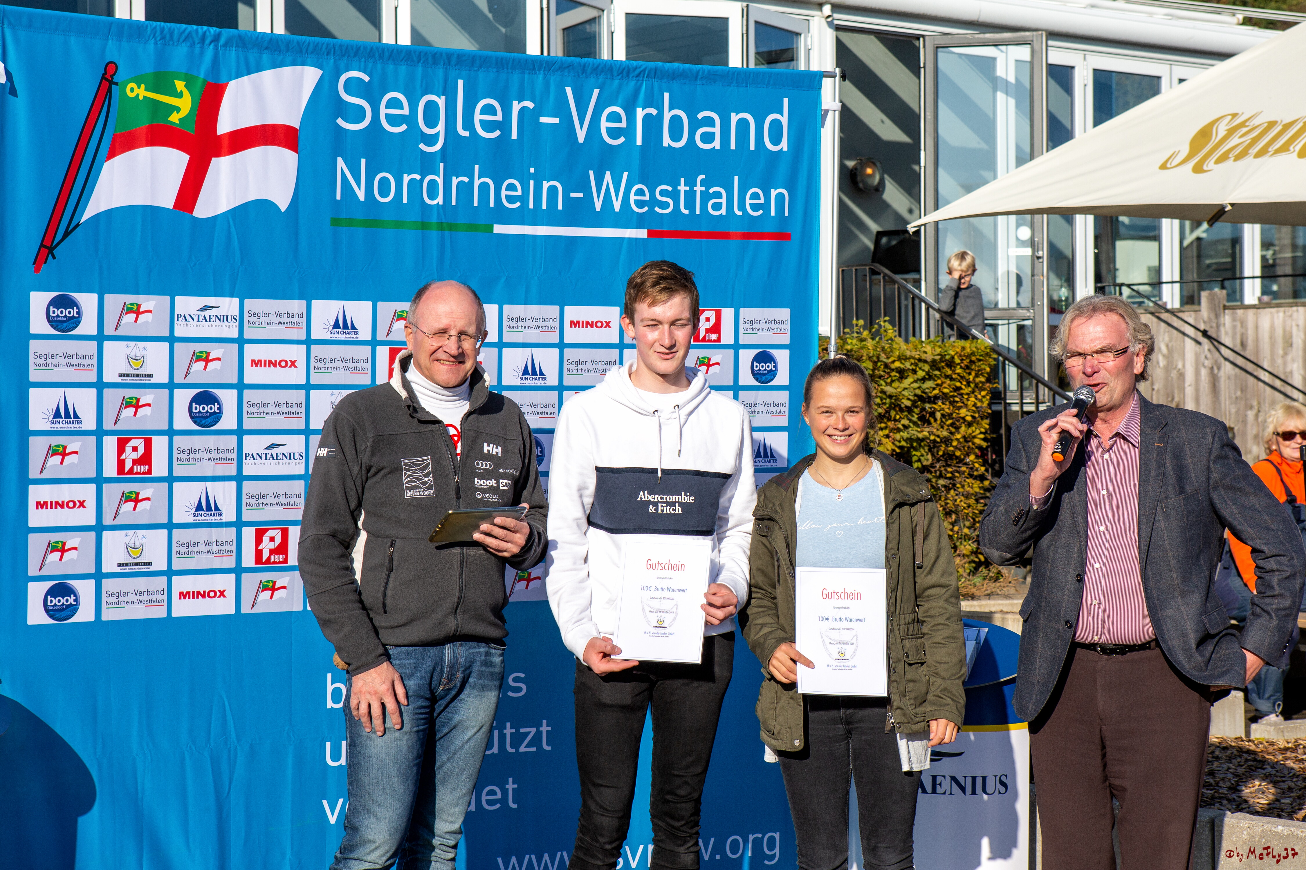 Platz 3 errangen die 420er-Landesmeister Anna Maria Klasen und Moritz Frankhoff, die sich über Gutscheine der Firma von der Linden freuten.