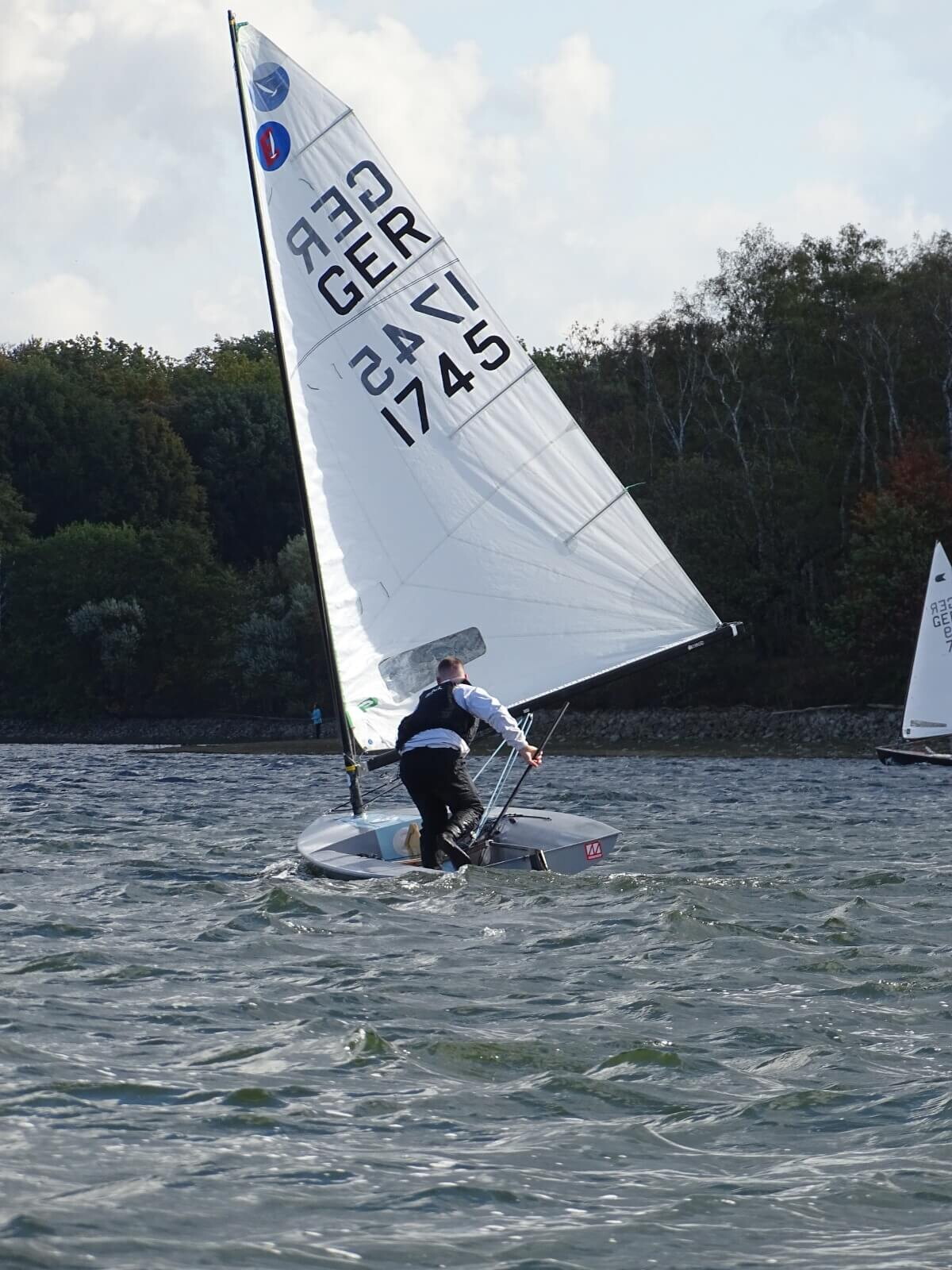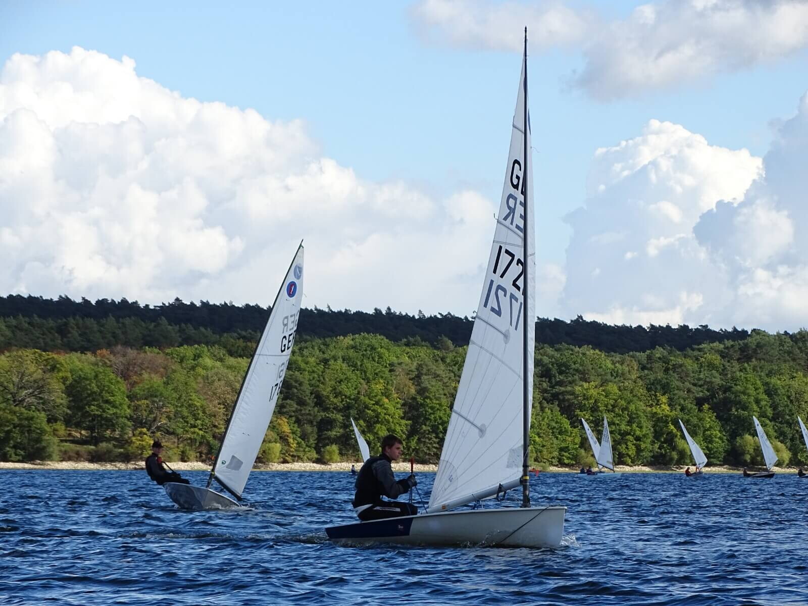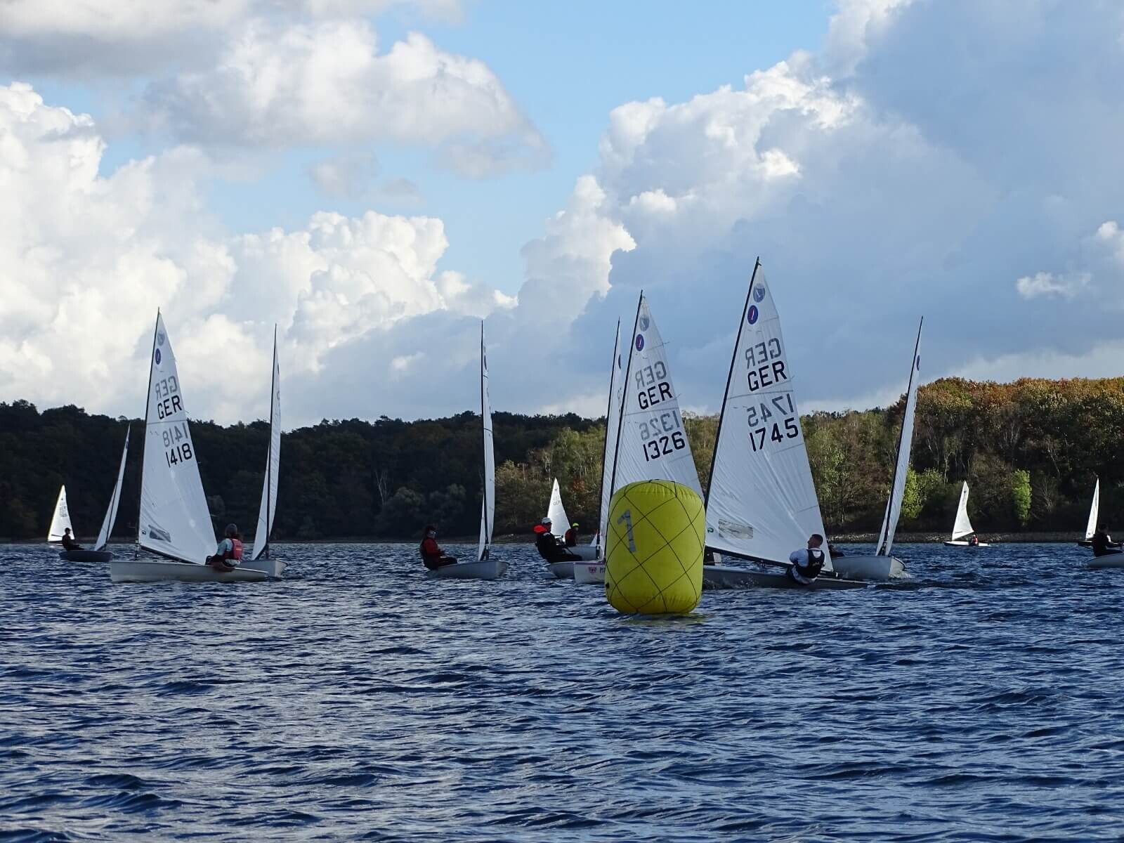 Sie lenken den Wind ab und verwirbeln ihn, was besonders an der Luvtonne zu spannenden Positionskämpfen führte, vor allem direkt nach den Starts, wenn das Feld noch dicht beieinander lag, mussten die Seglerinnen und Segler besonders aufmerksam sein. Insbesondere für einige Teilnehmer in der OK-Jolle mögen die Bedingungen in Haltern eine großer Kontrast zur vorherigen Regatta gewesen sein. Während der Europameisterschaft in Bandol an französischen Côte d´Azur segelten sie Anfang Oktober noch bei Mistral und bis zu zwei Meter Mittelmeerwelle.