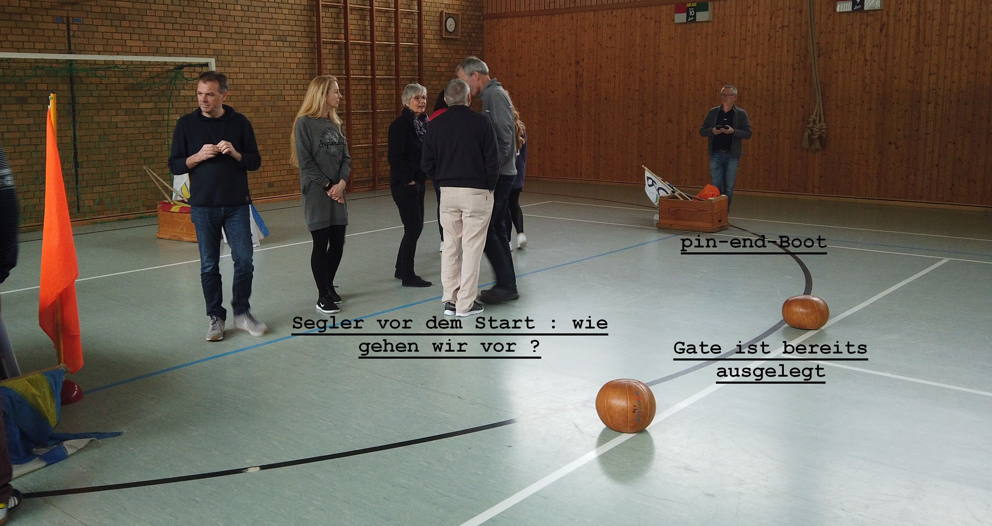 Das Gelernte wurde auch flott in Wettfahrten umgesetzt. Aber wie? Ganz einfach: mit Medizinbällen als Tonnen, kleinen Kästen als Begleitbooten und einem großen Kasten als Startschiff.