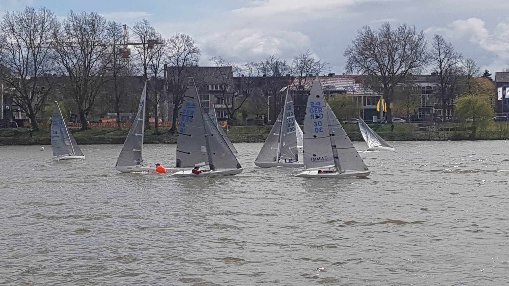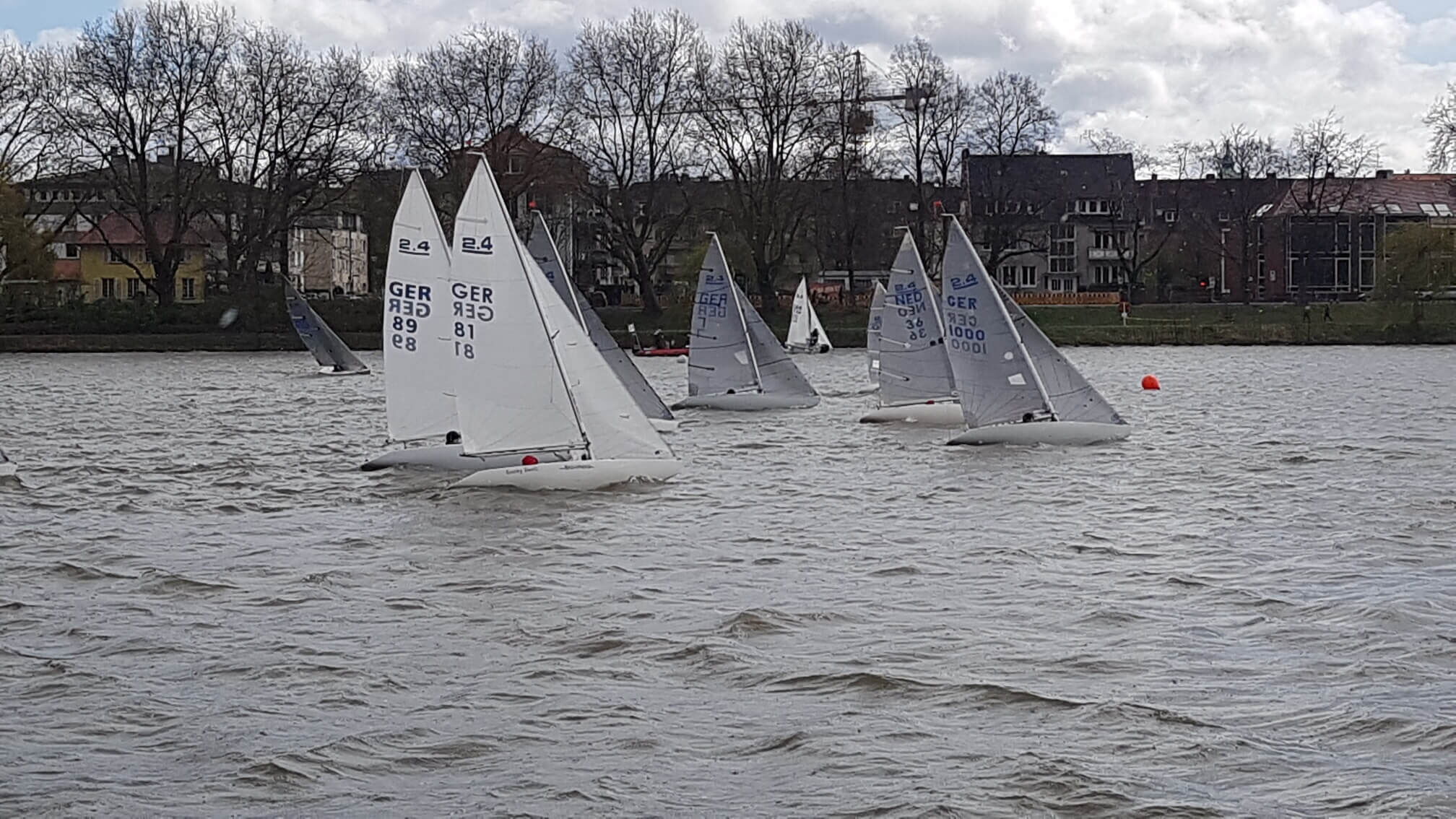 25 Boote hatten gemeldet, am Start des Münsterpokals der 2.4 mR, der Ex paralympischen Einmann- Kielbootsklasse waren 23 Boote die mit harten Bedingungen auf dem sonst so friedlichen Aasee zu kämpfen hatten. Für einige SeglerInnen war es am ersten Regattatag bei starkem und böigem Wind echt zu hart, sie gaben auf. „Urs Infangers Boot ist bei einer unglücklichen Halse fast voll Wasser gelaufen!“