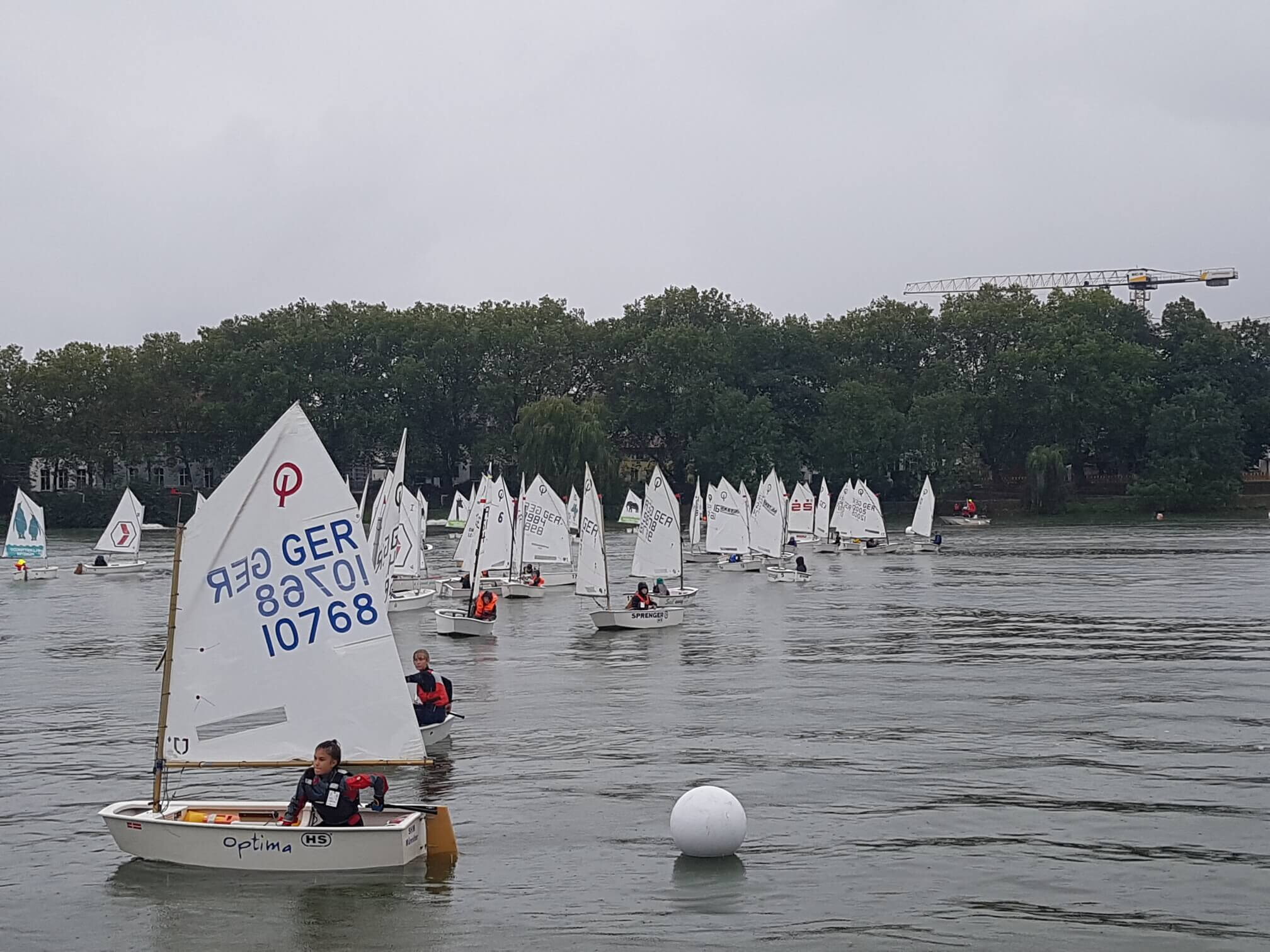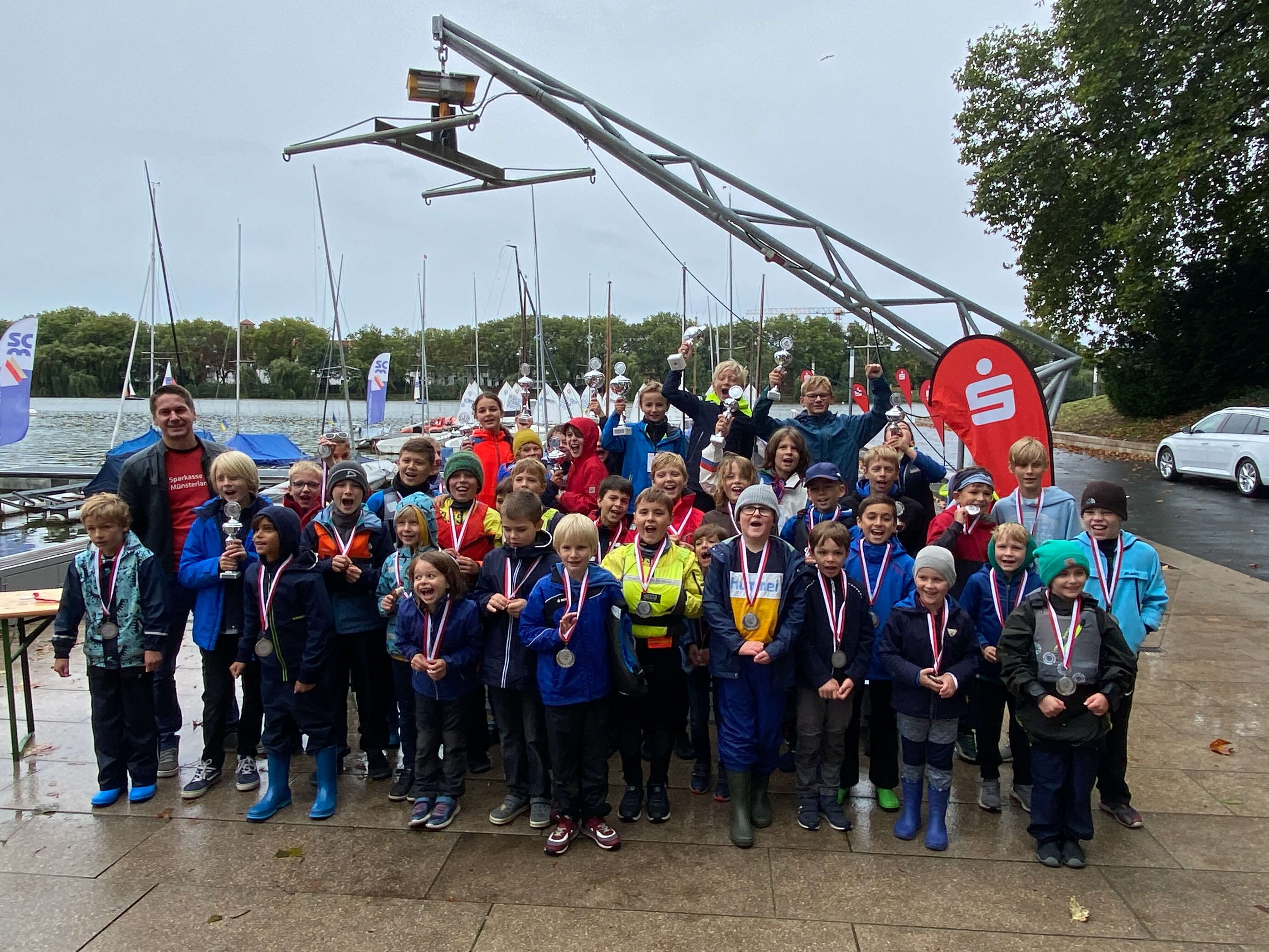 Ausgerichtet wurde das besondere Segelevent für die Jüngsten Segler auf dem Aasee von der Segelschule Overschmidt und dem Segel-Club-Münster (SCM). Es wurde in zwei Klassen – Overschmidt Segelschüler und Vereinssegler gestartet. 65 Boote waren gemeldet, wg. kurzfristiger Absagen gingen aber immer noch rekordverdächtige 52 junge SeglerInnnen an den Start. Trotz des regenreichen und für die Kids echt kalten Wetters hielten die Kinder vom SCM, vom Segelclub Hansa, vom WYD Möhnesee und der Segelschule Overschmidt tapfer und mit Freude durch. Gesegelt wurden 3 Läufe im Up-and-Down Kurs.
