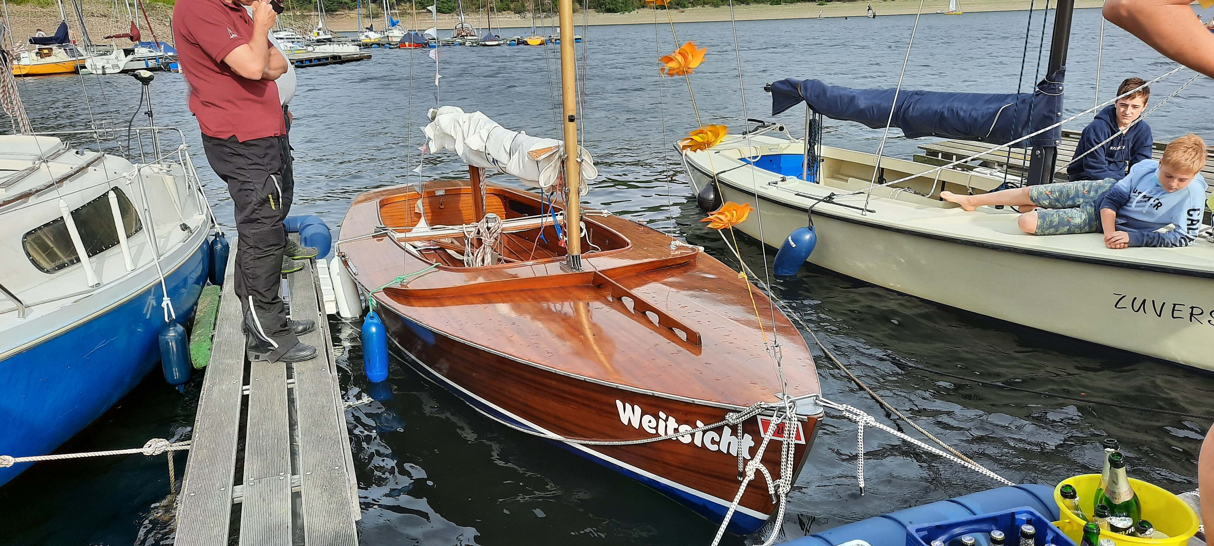 Nach der Siegerehrung gab es (selbstverständlich mit Abstand) Kaffee und Kuchen. Anschließend stand noch ein besonderes Ereignis an, nämlich die Taufe eines neuen (gebrauchtem) Clubbootes, einem Kielzugvogel. Zünftig mit einer Flasche Sekt wurde das neue Boot auf den Namen "Weitsicht" getauft, passend zu den andern Namen der Clubboote, die alle auf „…sicht“ enden. Das wunderschöne Holzboot ist eine großzügige Spende der Familie Potrawa aus Aldenhoven und wurde von den anwesenden SCJ Mitgliedern bestaunt. Das Ehepaar Potrawa war bei der Zeremonie dabei und konnte sehen, dass sich der Kielzugvogel beim SCJ in guten Händen befindet. Das Boot bildet nun eine schöne Ergänzung zu dem bereits vorhandenen Regatta-Kielzugvogel mit dem Namen „Gleitsicht“ und komplettiert die Familie der SCJ-Clubboote. Mittlerweile ist der SCJ stolzer Besitzer von fünf Kielbooten, die den Mitgliedern des Vereins zur Verfügung stehen.