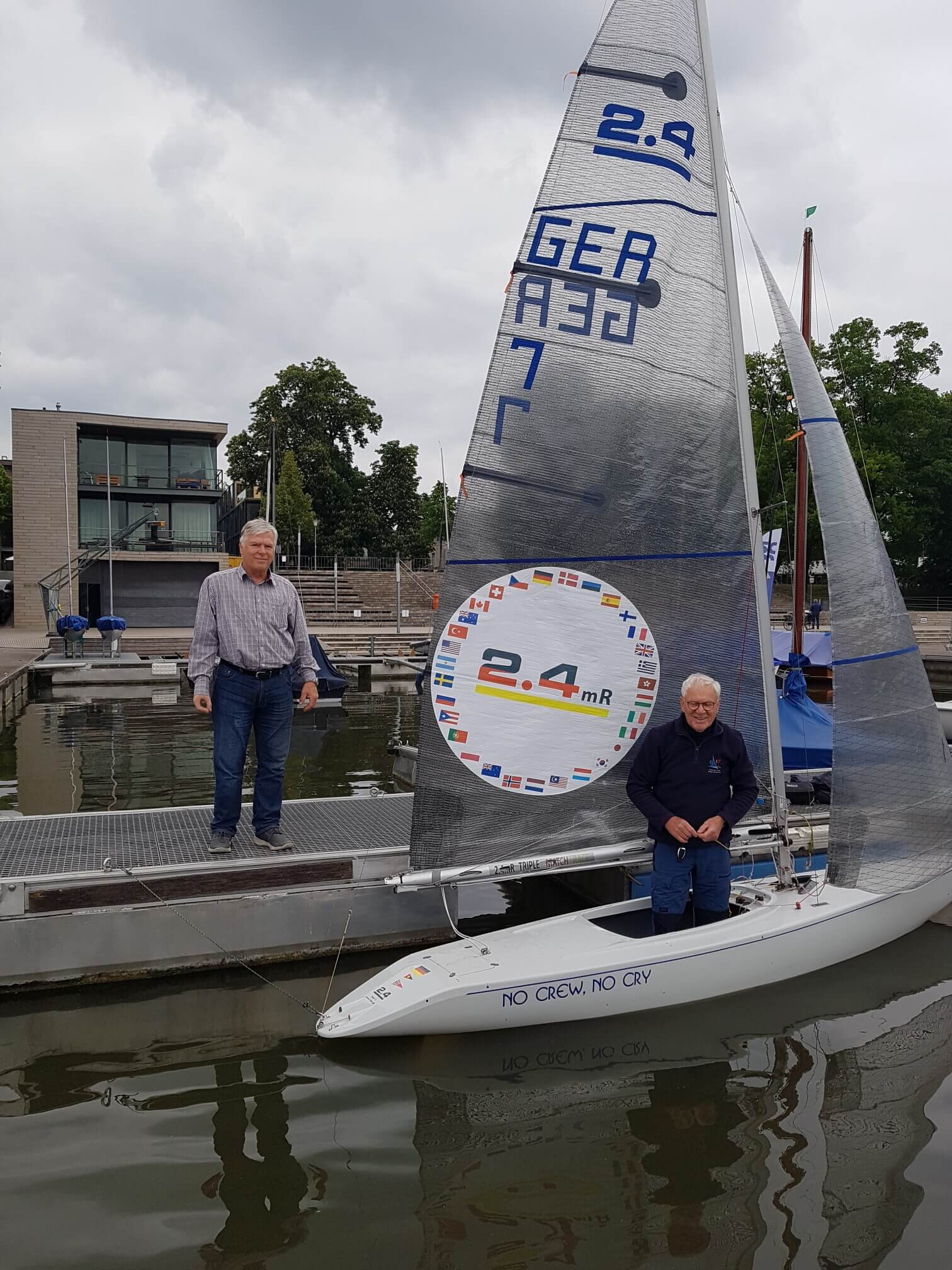 Wieso auf dem Aasee- ganz einfach: das neuen Boot der Segellegende wurde im Münster bei Stefan Kaste‘s Firma FOR-SAIL (Gewerbegebiet Nord Rudolf Diesel Straße) ausgebaut und optimiert, nachdem der Rumpf mit einem neuen Design in England produziert wurde. Da in Münster beim SCM eine starke Flotte der kleinen 2.4mR Yachten zu Hause ist und gute Kontakte zum heimischen Segel Club bestehen, war es klar, dass die ersten Trimmschläge in Münster stattfinden sollten, um ggf. technische Nachbesserungen vornehmen zu können. Vorher wurde Libors Boot und eine weitere Super 3 von Stefan Kaste, so heißt diese Variante der 2.4mR Klasse, noch akribisch vermessen und ein „Sinktest“ (es handelt sich um Kielboote und die müssen immer genügend Auftrieb haben) durchgeführt, um genau den internationalen Klassenvor-schriften zu entsprechen.