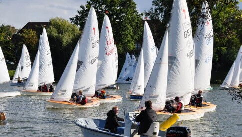 Der Rest des diesjährigen Aaseepokals ist schnell berichtet. Am Samstag konnte Wettfahrtleiter Jules Tronquet mit seinem professionell agierendem Team bei unerwartet guten Wetter mit zwar abflauenden, aber dennoch ganz guten Winden, vier Läufe über den Aasee bringen. Die beiden letzten Läufe bei recht wenig und aaseetypisch glücksspielhaften Windver-hältnissen waren grenzwertig. Aber der Wetterbericht ver-sprach für Sonntag noch weniger Wind. Und genau so kam es den auch – Sonntag konnte mangels Wind nicht mehr gestartet werden. So konnten bei dem speziellen „Aaseemodus“ - hier werden die über 60 Crews in Gruppen eingeteilt, um es möglich zu machen, das sich zwei Crews eine Boot teilen – und dennoch jeder dran kommt- immer zwei der vier Gruppen gegeneinander fahren. Wenn es sechs Läufe geworden wären, hätte jede Gruppe einmal gegen jede andere gesegelt. Aber der Wind machte den Plan zu Nichte.
