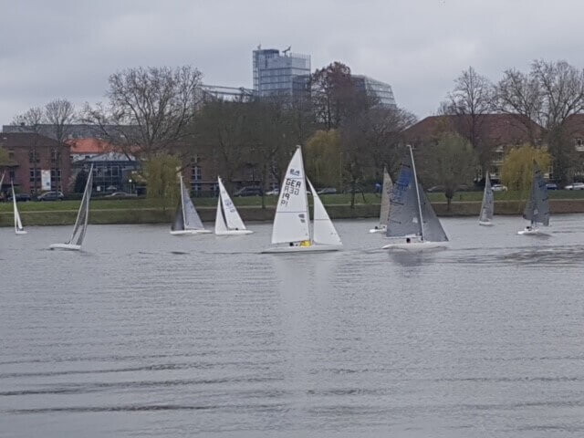 Die schnittigen Einmannkielboote 2der2.4mR Klasse haben sich bei schwierigen Wind- und Wetterverhältnissen auf dem Aasee nichts geschenkt. Vorne waren wieder mal die Altmeister Ulli Libor vor Detlef Müller Böing und Moritz Jacobs. Der Münster Pokal der 2.4 war, nach aller Meinung, ein Topp Event von großer sportlicher Klasse.