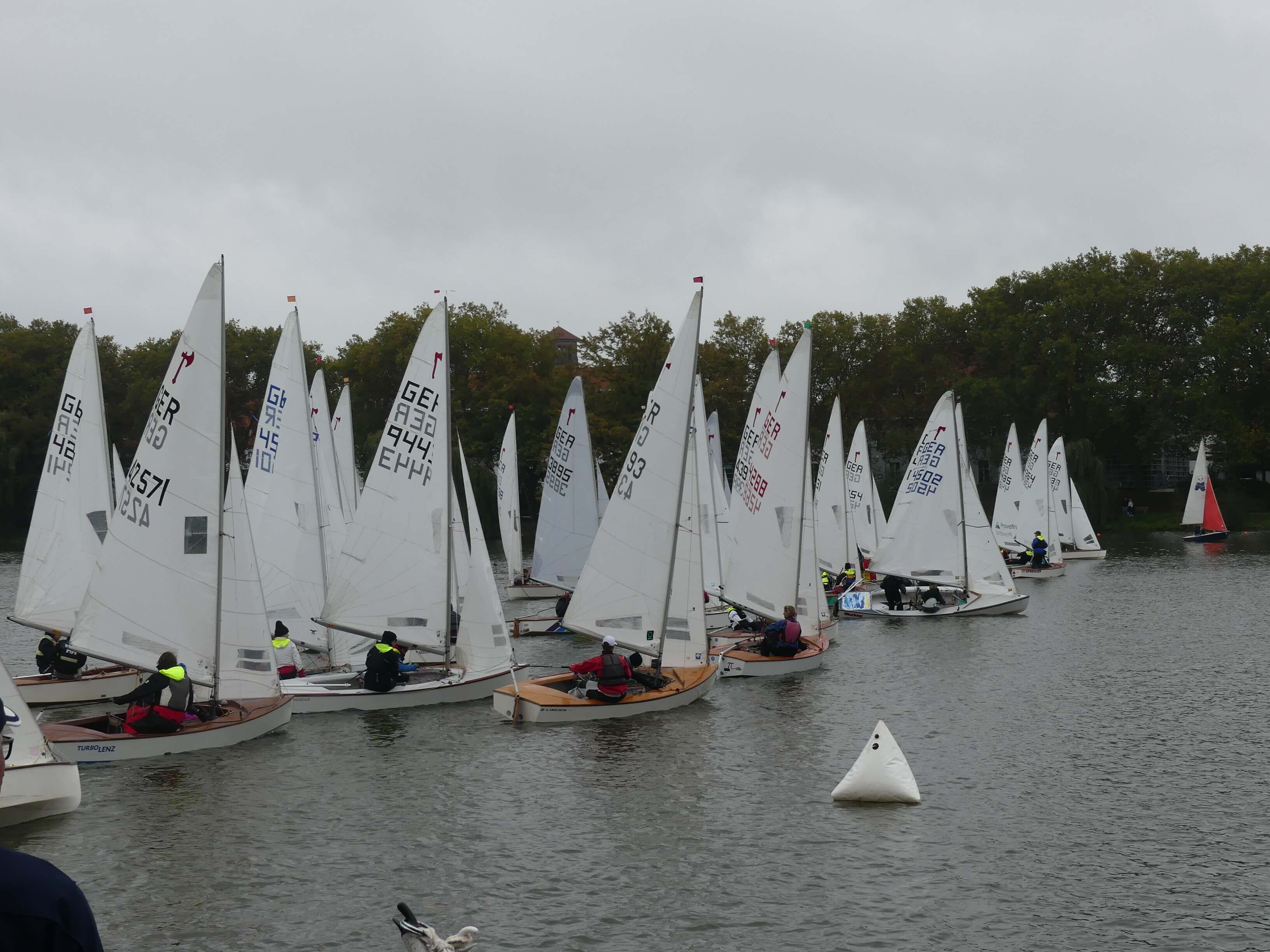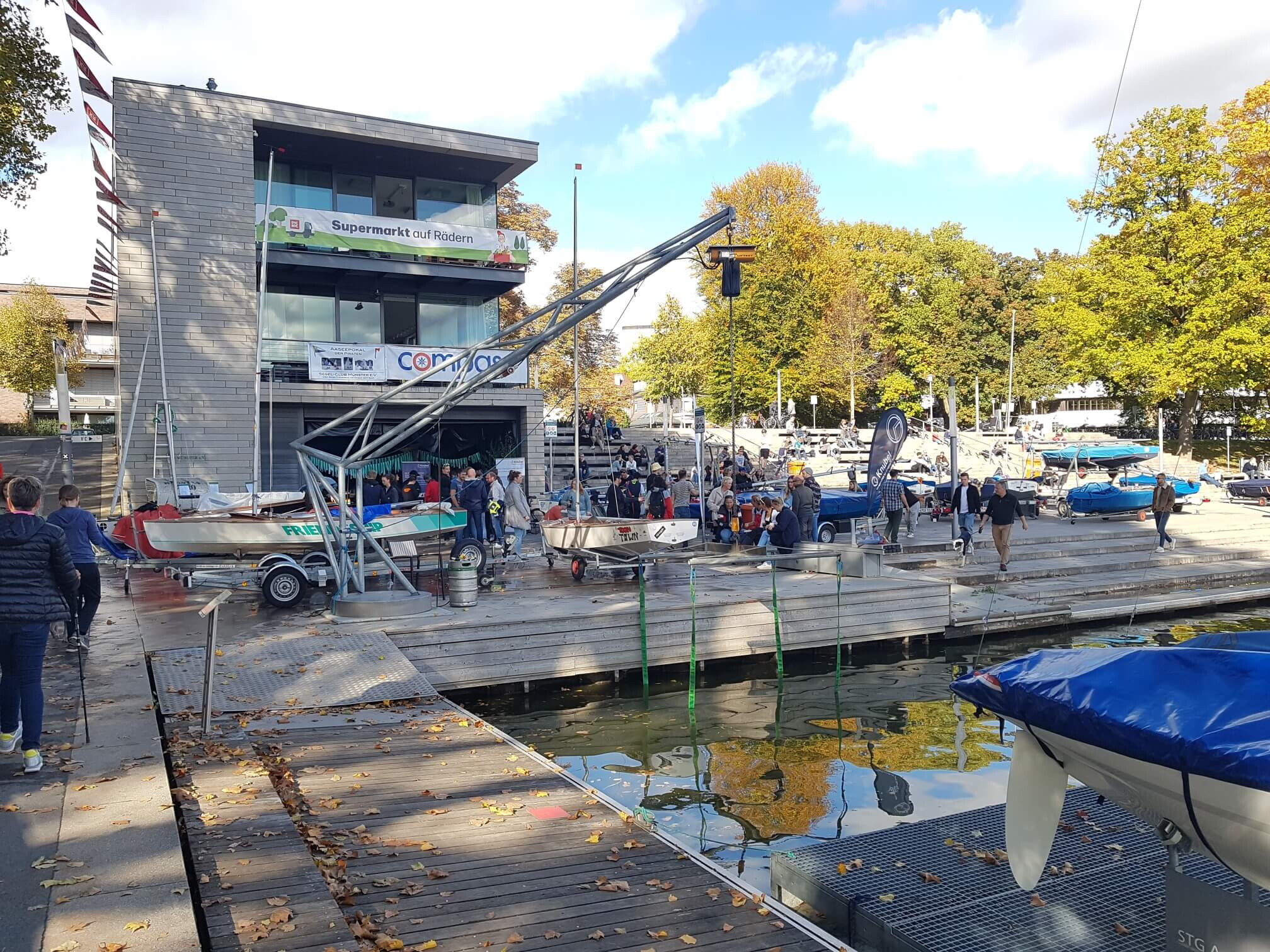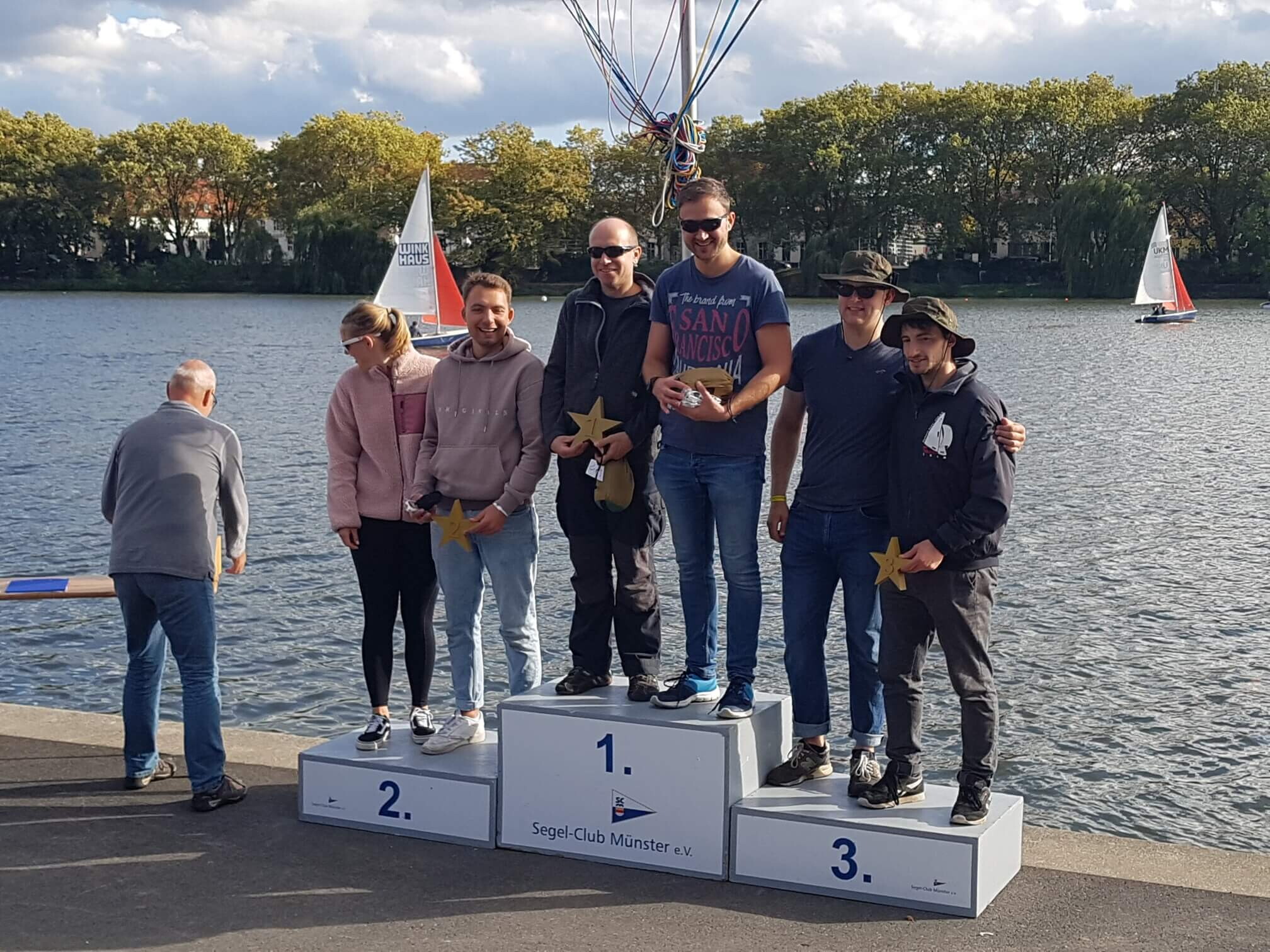 In den Pausen zwischen den Wettfahrten wird dann flink die Crew und das Segel gewechselt. Das nassen und schwierige Wetter hielt die zahlreichen Crews und Ihre BegleiterInnen nicht davon ab , abends in Clubhaus des SCM eine Riesensaison Abschlussfete bis in den Morgen zu feiern. Danach ginge es dann nahe zu umgehend wieder auf die Regattabahn. Nach insgesamt 6 aufregenden Wettfahrten standen dann dieses Mal die Münsteraner Carsten Wiegel/Thorsten Krug ganz oben auf dem Treppchen. Beide haben 2018 den Aaseepokal, der seit gut 50 Jahren läuft schon einmal gewonnen.