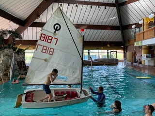 Aber nicht nur die Jugendlichen und ihre Trainer durften mit ins Wasser, sondern auch ein komplettes Segelboot, ein sogenannter Optimist, samt Mast und Segel. Natürlich hatte die Gruppe eine Menge Spaß, jedoch galt es auch eine wichtige Übungseinheit zu absolvieren, nämlich das Kentern mit dem Boot und das Wiedereinsteigen, falls man doch mal unbeabsichtigt über Bord gegangen ist. Dass das nicht so einfach ist, insbesondere wenn sich die Kleidung mit Wasser vollgesogen hat, ist allen nun klar. Aber die Segler kennen nun auch die passenden Handgriffe, mit denen das Boot zunächst wieder aufgerichtet und anschließend gefahrlos wieder bestiegen werden kann. So sind alle gut gerüstet für die neue Segelsaison auf dem Emssee und bei der ein oder anderen Regatta.