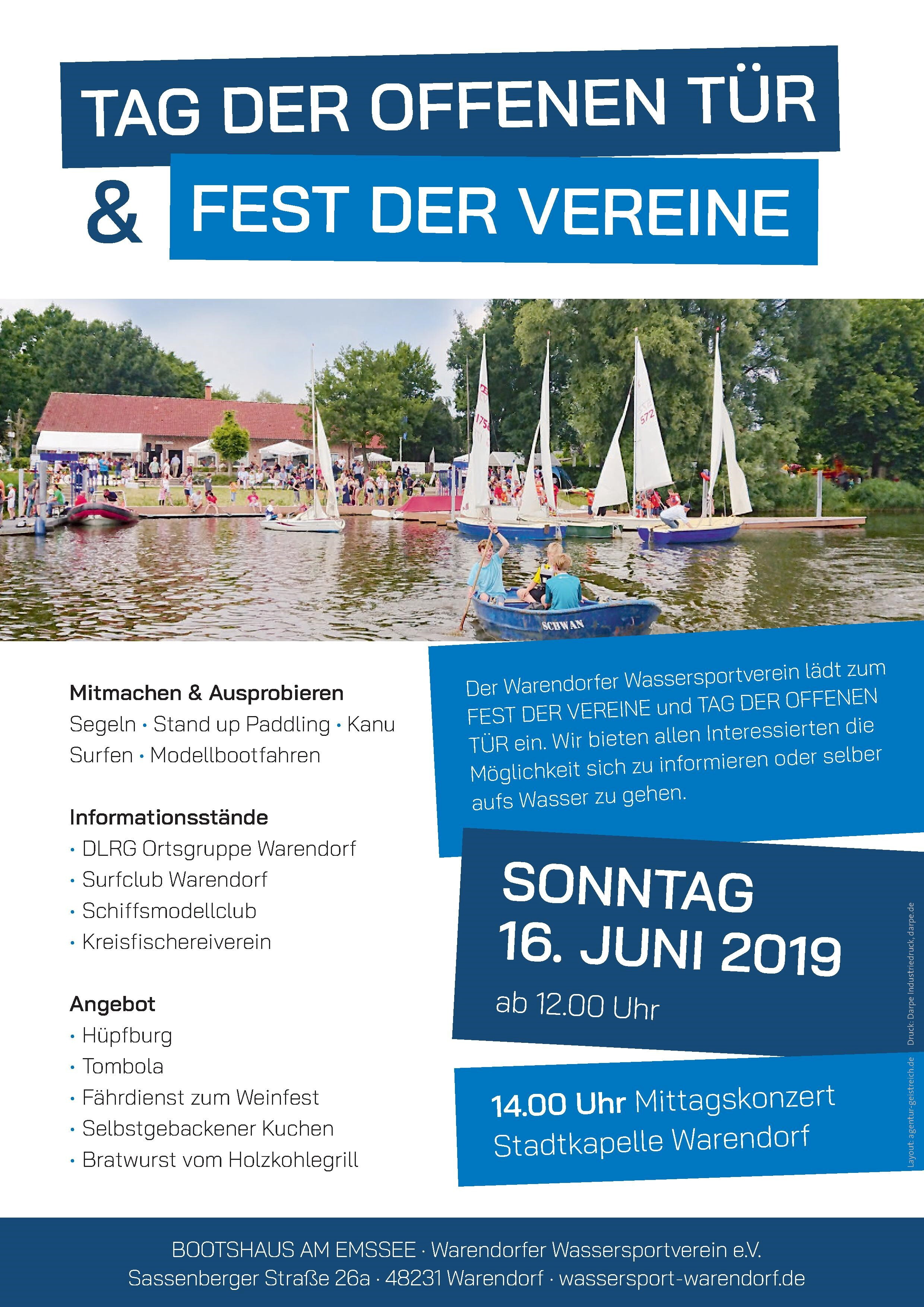 Parallel zum Weinfest lädt der Warendorfer Wassersportverein e.V. (WWV) alle Interessierten am Sonntag, den 16. Juni zum Tag der offenen Tür am Bootshaus an der Sassenberger Straße ein. In der Zeit von 12-18 Uhr können die unterschiedlichsten Wassersportarten am Emssee in Warendorf kostenlos ausprobiert werden. Neben dem Segeln, Stand up Paddling, Kanu fahren und Rudern stehen die verantwortlichen Trainer und Ausbilder für Beratungen zu allen Angeboten des Vereins zur Verfügung. Für das Stand up Paddling ist es ratsam Bade- oder Sportbekleidung und ein Handtuch mitzubringen.