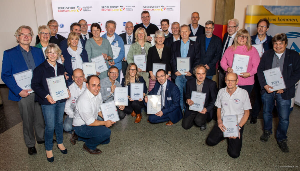 Die Anerkennung für die sehr gute Ausbildung ging nicht nur an die großen Vereine, die in absoluten Zahlen einen guten Stand bei der Ausbildung für die Führerscheine ausweisen können, sondern auch an kleine Vereine, die in Relation zu ihrer Mitgliederzahl ein hohes Maß an Ausbildung bieten und zahlreiche Prüfungen ablegen. Zahlreiche Vereinsvertreter trafen sich daher zum Verbandstag zu einem Gruppenbild und konnten sich damit in bester Gesellschaft derjenigen präsentieren, die für eine starken Segelnachwuchs und eine gelungene Weiterbildung sorgen.