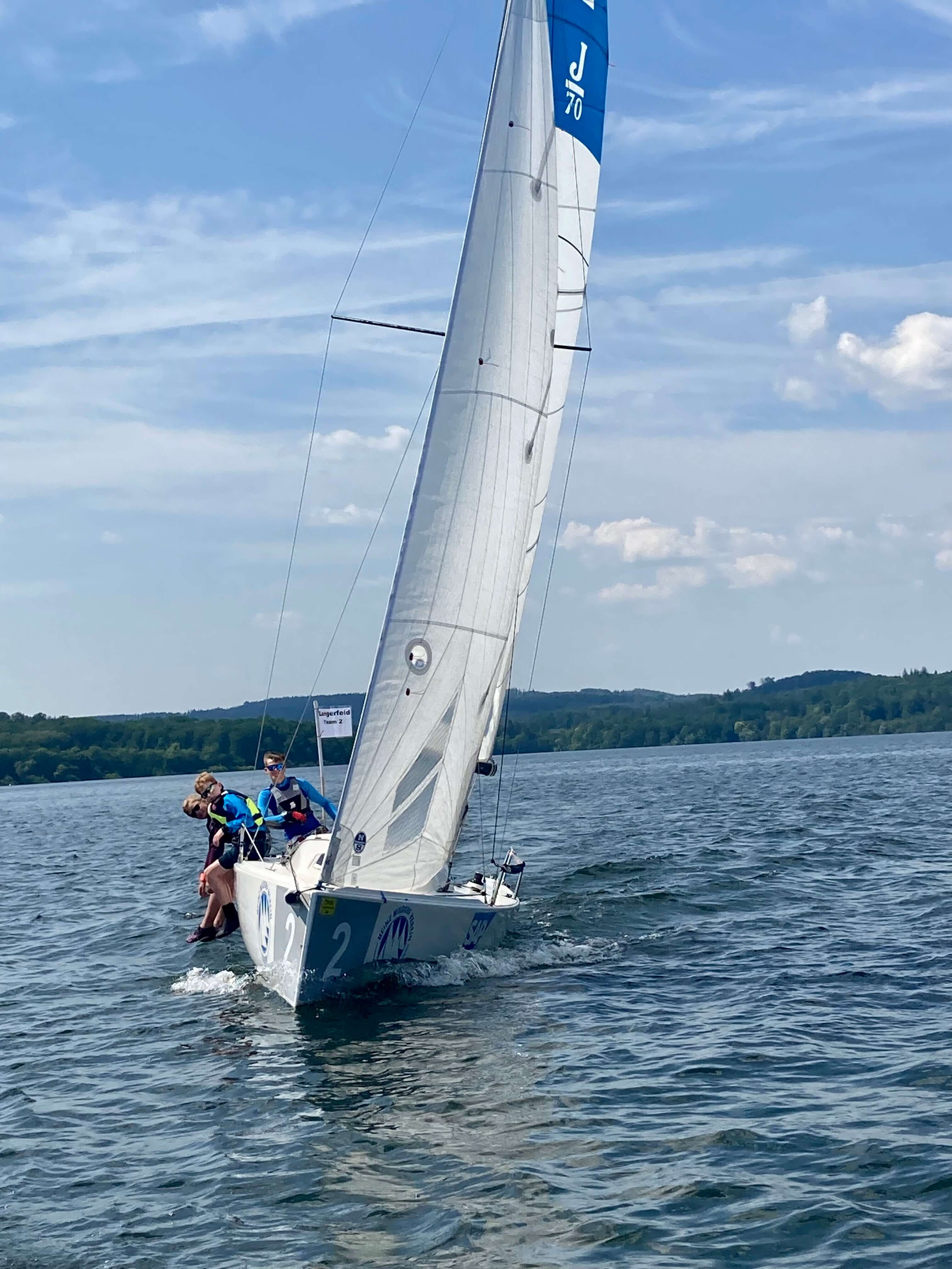 5 Teams aus ganz NRW kamen zum Möhnesee, um bei traumhaftem Wetter an die 30 Grad und konstantem Ostwind um die Schulmeisterschaft zu segeln. 4 Schüler*innen einer Schule bildeten ein Team. Mit an Bord war eine Lehrperson, die aber nicht aktiv ins Geschehen eingreifen durfte.