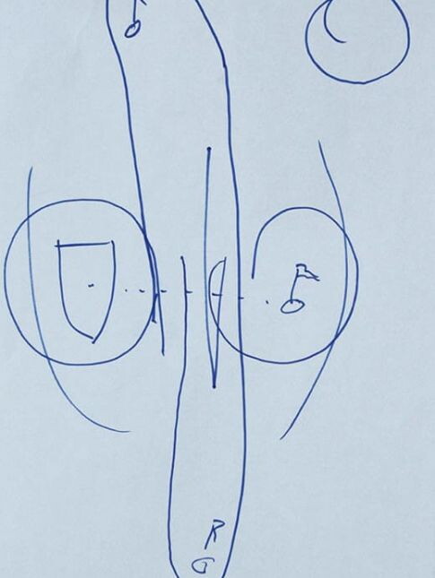 Ganz links ist das Start und Zielboot, daneben eine Tonne, die Strichellinie ist die Start u Ziellinie. Nach dem Start geht es zuerst nach unten um die Luvtonne herum, die muss mit Backboard passiert werden, dann hoch zur Leetonne und wieder zurück, über die gestrichelte Linie. Wenn auf dem Startboot eine Nummerntafel mit einer 2 erscheint, durften wir 2 Runden fahren.