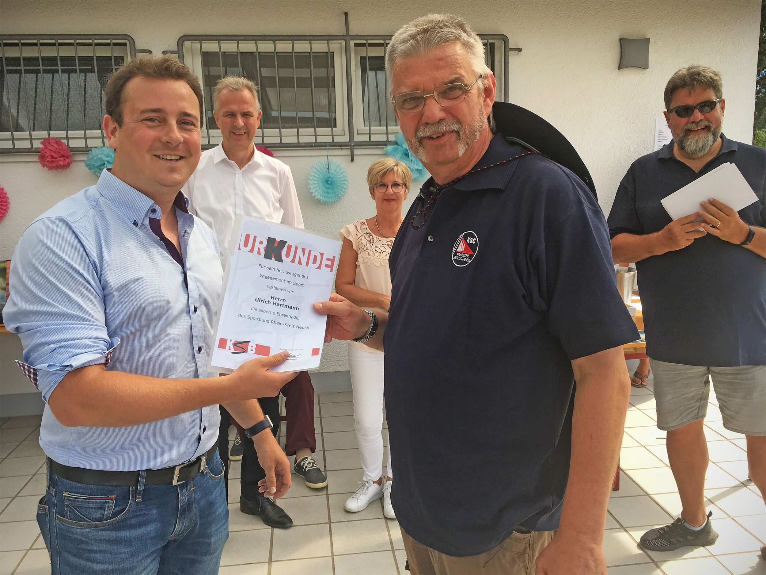 Für seine über 30-jährige ehrenamtliche Arbeit mit Segelschülern und Jugendlichen im Kaarster Segel-Club e.V. erhielt KSC-Urgestein Ulrich Hartmann die silberne Ehrennadel des Kreissportbundes Neuss aus den Händen des Geschäftsführers Dominik Steiner.