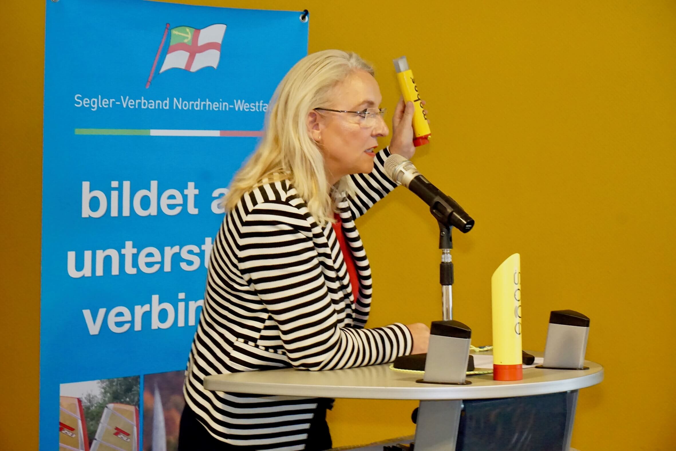 Christiane Linkenbach stellte MOBOS vor und bekam viel Zustimmung für das von der Firma Seareq entwickeltes Rettungssystem. Mit viel Leidenschaft präsentierte Sie, wie einfach und zuverlässig MOBOS Leben retten kann. Interessant für die Zuhörer waren die Ausführungen auch deshalb, weil es weltweit das einzige Mensch-über-Bord-System ist, das auch in Binnengewässern benutzt werden darf!