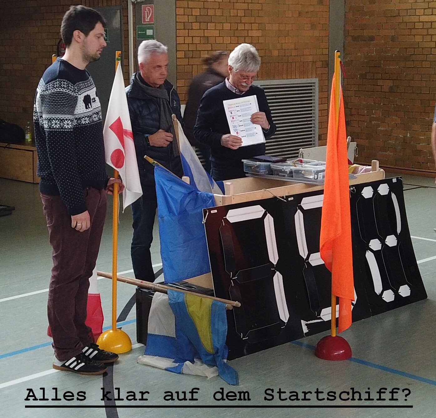 Die Teilnehmer wurden in „Funktionäre“ und Regatta-Teilnehmer eingeteilt, und dann gings es los. Natürlich hatten wir auch „Wind“ (Wolfgang Jentsch) in der Halle, leider genauso launisch wie im realen Leben: mal stetig (in) West, mal drehte sich der „Wind“, was eine Bahnänderung zur Folge hatte; oder er ging - einfach - weg: Abbruch!
