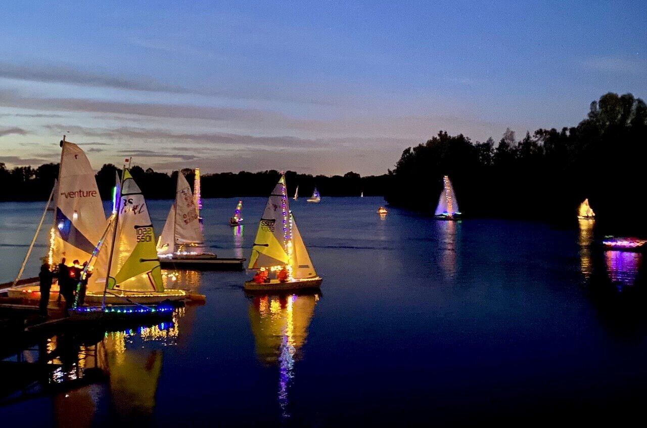 Es gibt wohl kaum eine schönere Art, die aktive Segelsaison vor der Winterpause zu beenden: am 3. November 2023 fand das traditionelle Laternensegeln am Elfrather See in Krefeld statt. Initiator war der Segelclub-Crefeld e.V. (SCCR), der seit Jahren Anfang November zu diesem stimmungsvollen Saisonende einlädt. Inzwischen nehmen auch die anderen am Elfrather See ansässigen Segelvereine (Segelklub Bayer Uerdingen, Krefelder Segel Klub und TV-Vennikel) teil und sorgen gemeinsam für farbenfrohen Lichterglanz auf dem Wasser.