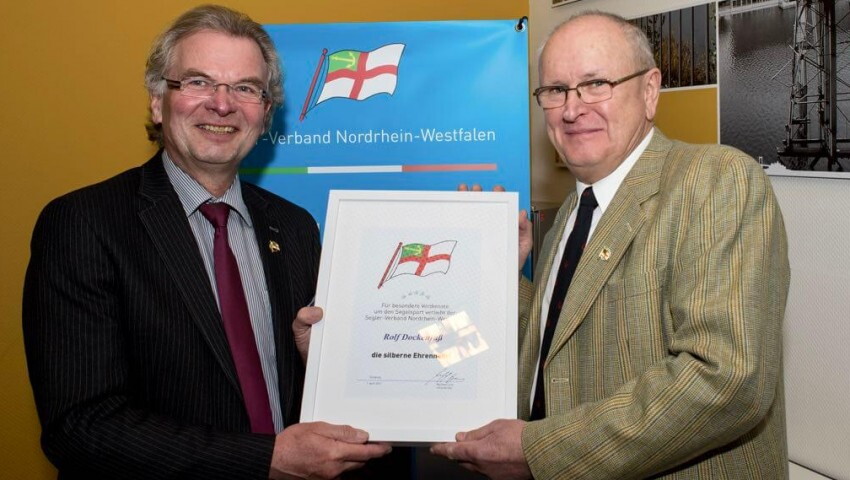 Eine weitere silberne Ehrennadel geht an Rolf Dockenfuß vom Oberhausener Segel-Club, der 1985 nicht nur an der Gründung des Vereins maßgeblich beteiligt war, sondern Vorsitz, Finanzen und Ausbildung übernahm und somit die Basis für einen gut aufgestellten und funktionierenden Verein lieferte.