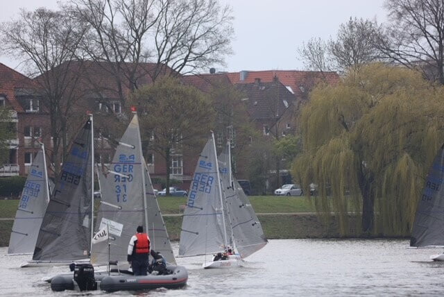 Die schnittigen Einmannkielboote 2der2.4mR Klasse haben sich bei schwierigen Wind- und Wetterverhältnissen auf dem Aasee nichts geschenkt. Vorne waren wieder mal die Altmeister Ulli Libor vor Detlef Müller Böing und Moritz Jacobs. Der Münster Pokal der 2.4 war, nach aller Meinung, ein Topp Event von großer sportlicher Klasse.