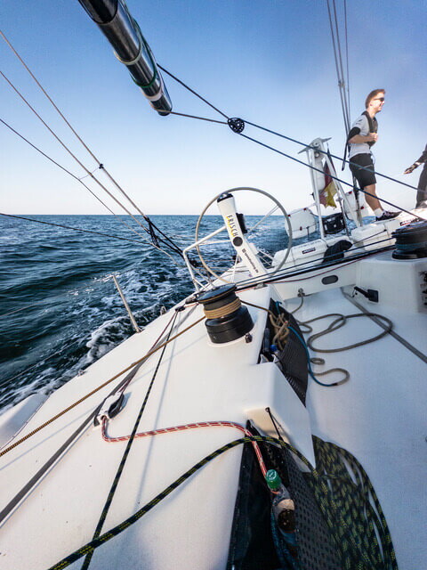 Sofort setzt das Boot den wenigen Wind auf der Warnow in Speed um. So richtig los geht es jedoch erst, als auch das Vorsegel steht. Der Skipper lässt das Vorsegel aber erst hinter dem Fährterminal setzen, weil sich das Boot an das enge Fahrwasser der Warnow halten muss. Mit mehr als 4 m Tiefgang wäre nur weniger Zentimeter außerhalb des Tonnenstrichs die Fahrt zu Ende. Und wir sind ja nicht allein im Fahrwasser. Bei leichtem Wind und mit „leichter“ Segelgarderobe fällt schon der besorgte Blick des Skippers auf die Logge. Wir messen 8 kn, wo doch im Hafen nur 6,5 kn erlaubt sind. Also Druck rausnehmen. Erst hinter den Molenköpfen von Warnemünde ändert sich das, wo wir bis auf Kreuzfahrer und Fähren freies Wasser haben. Sofort springt die Logge auf 9 kn. Wir entscheiden uns den Code Zero zu setzen und kommen schnell auf über 11 kn.